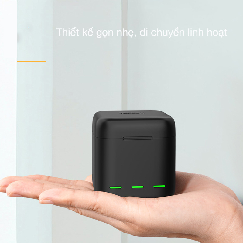 Mua tại TiktokDock sạc 3 pin cho Gopro 9 thương hiệu Telesin (kèm cáp sạc Type C) Bộ đế sạc cùng lúc 3 viên pin cho Gopro 9 Telesin, rất tiện dùng. Thiết kế dạng thanh nhỏ gọn, có nắp đậy pin an toàn. Dock sạc 3 pin Gopro có thể sạc với pin chính hãng theo máy. Hoặc pin thay thế của những thương hiệu khác. Đế sạc rời Gopro 9 tích hợp cổng kết nối Type-C có đèn LED báo nguồn. Trên Dock sạc Telesin có tích hợp đèn led trạng thái sạc, đèn hiển thị đỏ là đang sạc, khi chuyển xanh lá là đã sạc đầy pin.