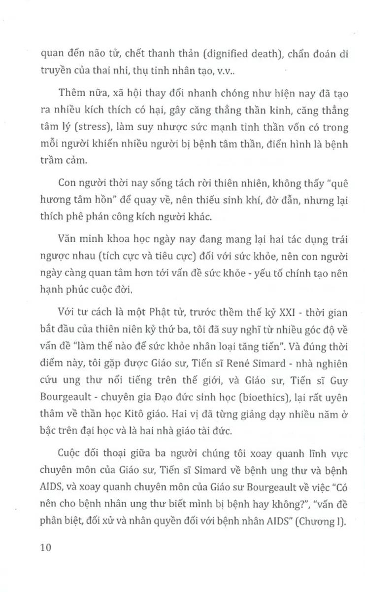 Cuốn sách được trình bày dưới hình thức một cuộc đối thoại, trao đổi cởi mở và đầy trách nhiệm giữa ba chuyên gia uy tín ở ba lĩnh vực chuyên môn khác nhau. Họ đã vượt qua rào cản về ngôn ngữ và những đặc thù của bối cảnh văn hóa, khoa học để cùng nhau thảo luận những vấn đề lớn mà nhân loại ngày nay đã và đang phải đối mặt như ung thư, HIV/AIDS, thụ tinh nhân tạo, bệnh trạng của văn minh vật chất, Thông qua cuộc đối thoại này, ba chuyên gia còn chia sẻ những kiến thức, những giải pháp và những hiểu biết sâu rộng về sức khỏe và bệnh tật, giáo dục nhân sinh quan cũng như triết lí riêng của họ về ý nghĩa cuộc sống; đồng thời khám phá những vấn đề về đạo đức và những tác động của nó đối với con người; từ đó mong muốn hướng tới một tương lai văn minh, lành mạnh cho nhân loại, nơi mà khoa học, tâm linh và tinh thần nhân văn được kết hợp một cách hài hòa.