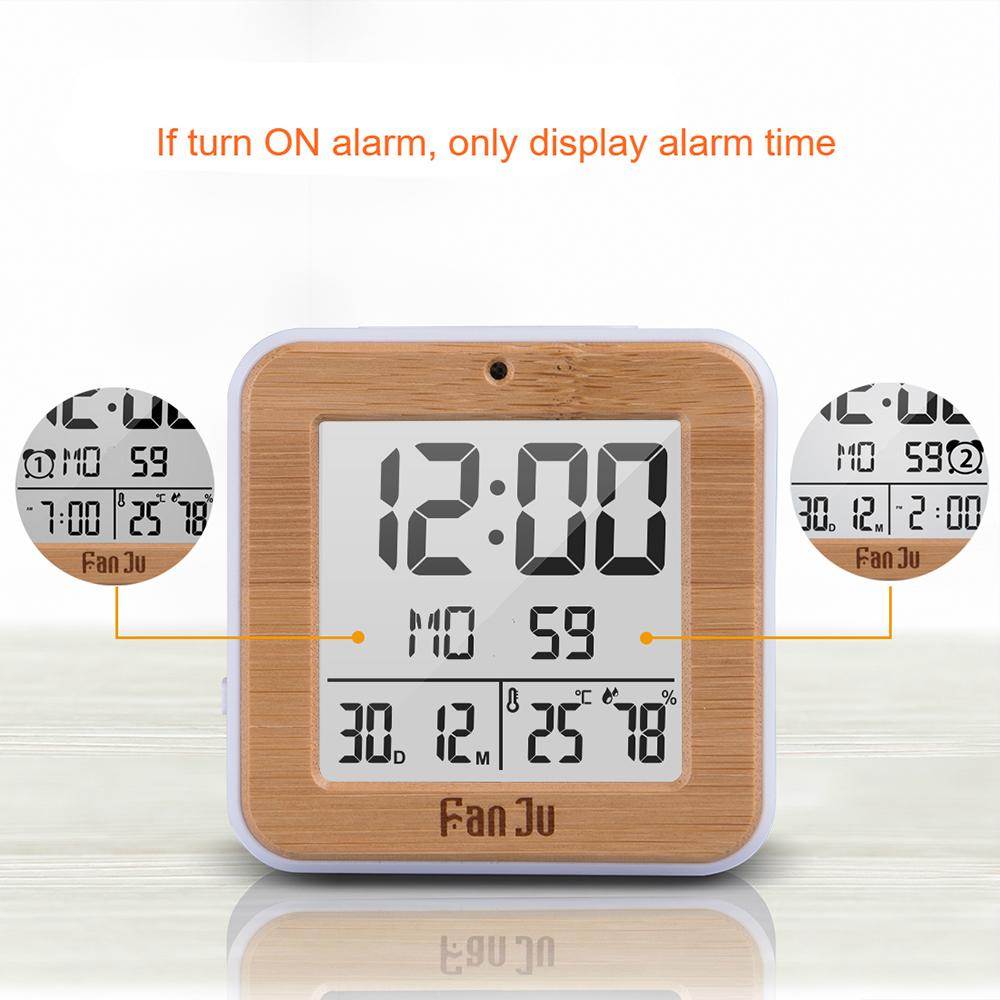 Features: Indoor temperature and humidity, and the temperature is in C/F units selectable. 12h/24h display format switchable. 2.8 LCD screen to display time, date, week, temperature and humidity clearly. Dual alarm clock and snooze function.