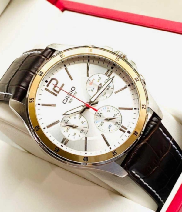 Đồng hồ Casio MTP-1374L-7AVDF dành cho nam với dây da cao cấp cùng mặt đồng hồ nền trắng viền vàng.