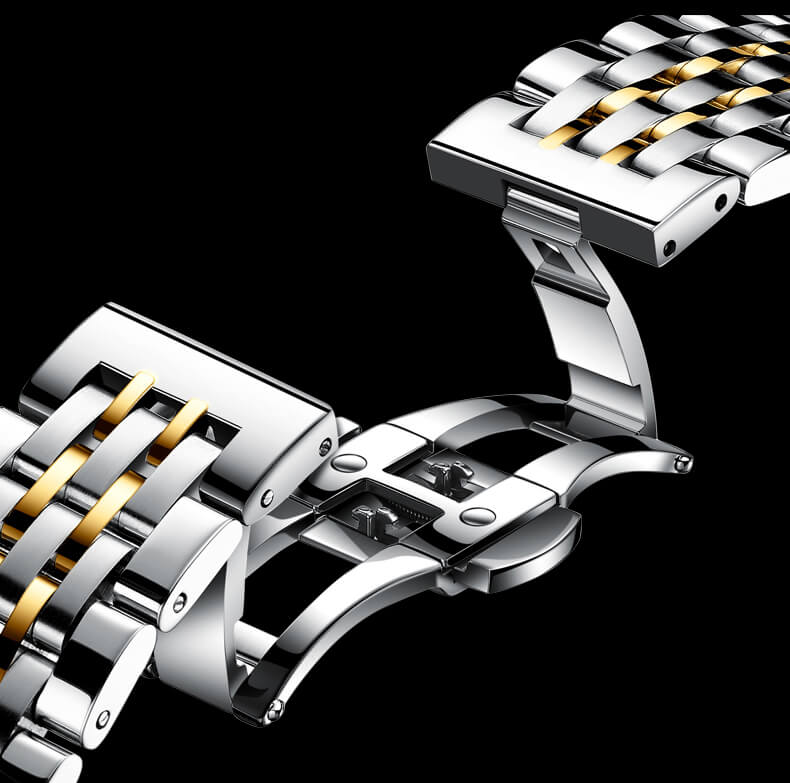 Đặc điểm kỹ thuật - - Vật liệu vỏ / gờ: Mạ ion - Chốt gập 3 chỉ với một lần bấm - Dây đeo bằng thép không gỉ - Mặt kính khoáng - Khả