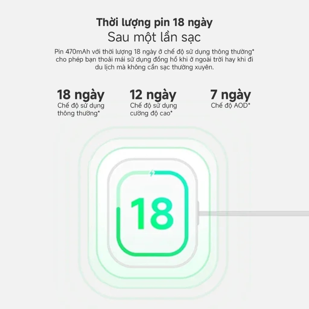 - Thời lượng pin tuyệt vời cho phép sử dụng lên đến 18 ngày chỉ với một lần sạc.