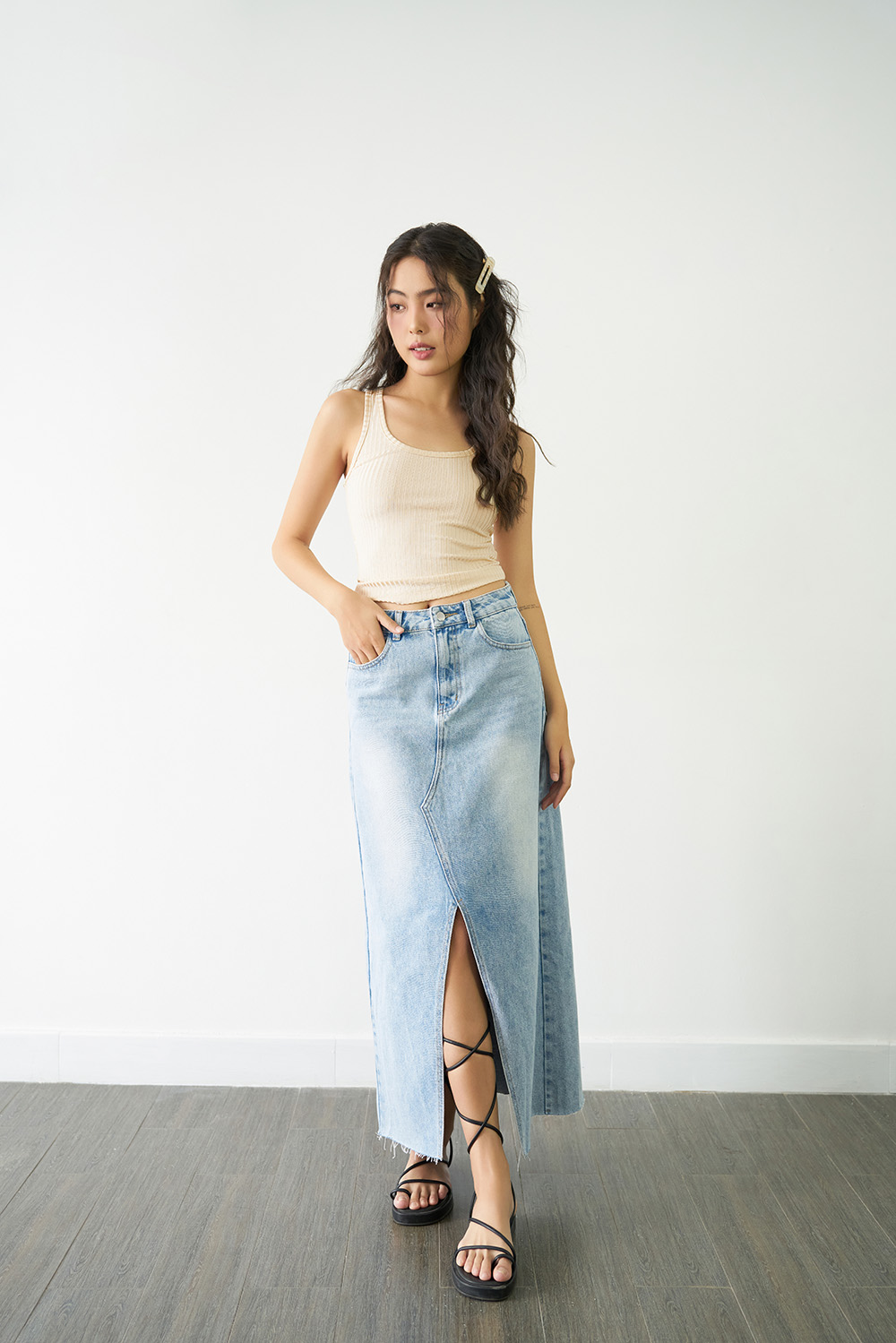 Chân váy jeans xanh dáng dài chữ A xẻ tà phía sau