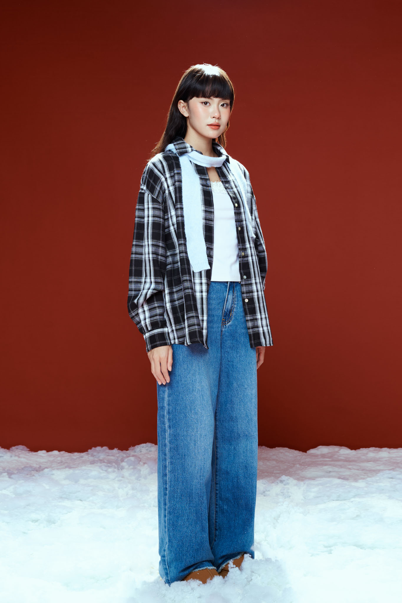 CHẤT SOMI COTTON PHA, ĐỨNG PHOM ÁO MÀU ĐỎ SỌC ĐEN ÁO CỔ SOMI, TAY DÀI, NẸP ÁO GIẤU NÚT PHOM CĂN BẢN SUÔN ĐIỂM NHẤN TAG LOGO NGAY NẸP ÁO