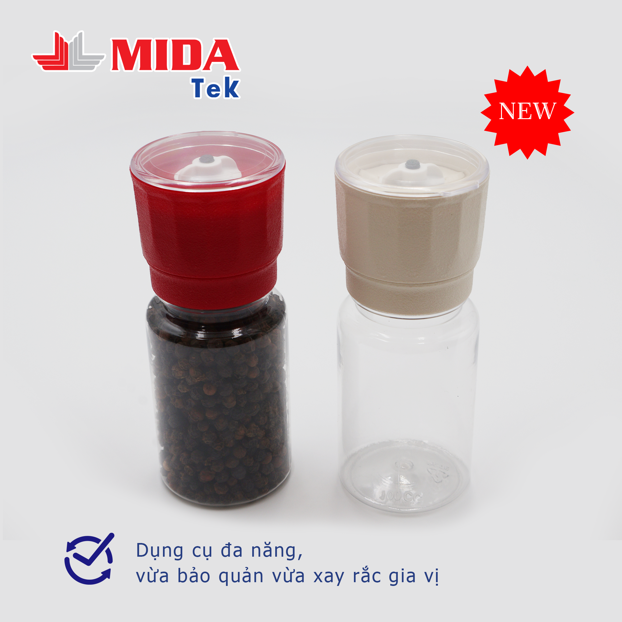 - Dụng cụ xay tiêu MIDATEK được làm từ nguyên liệu nhựa chính phẩm, đảm bảo an toàn sức khỏe, chắc chắn, là một vật dụng không thể thiếu trong bếp ăn của người nội trợ. Vừa là dụng cụ đựng bảo quản tiêu hạt, vừa giúp xay nhuyễn nhanh chóng, rắc tiêu trực tiếp lên bề mặt món ăn