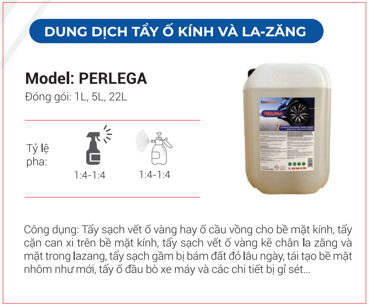 DUNG DỊCH TẨY Ố LAZANG VÀ TẨY Ố KÍNH PERLEGA Dung dịch làm sạch siêu tập trung & làm sạch các vết ôxi hoá và làm sáng bóng vành kim loại, bảo vệ bề