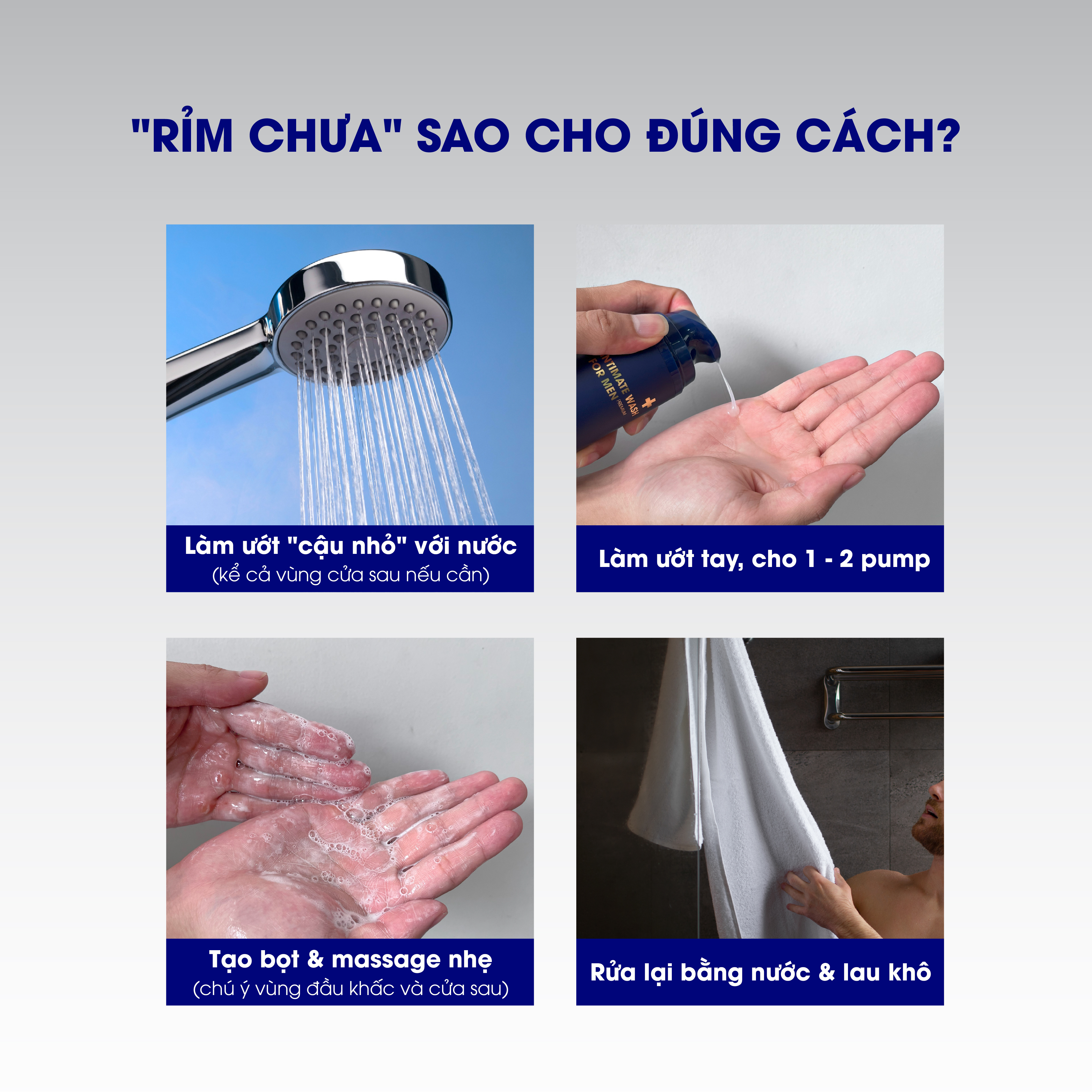 Sử dụng vào mỗi buổi sáng và tối. Lấy một lượng gel vừa đủ ra tay, tạo bọt và nhẹ nhàng massage cậu nhỏ (kể cả vùng “cửa sâu”). Sau đó rửa lại bằng nước mát và lau khô.