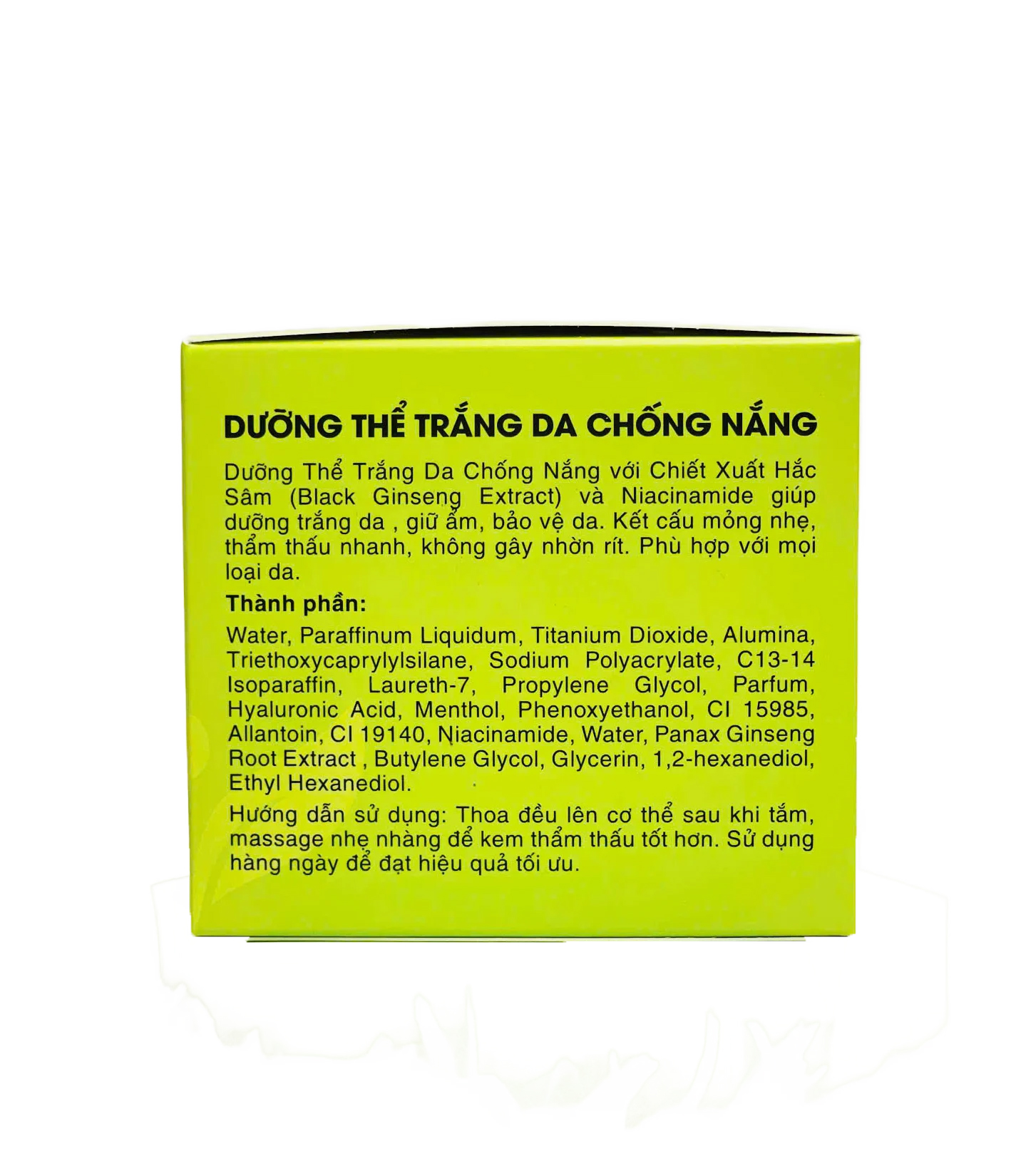 Dưỡng Thể Trắng Da Chống Nắng với Chiết Xuất Hắc Sâm (Black Ginseng Extract) và Niacinamide giúp dưỡng trắng da , giữ ẩm, bảo vệ da… - Kết cấu mỏng nhẹ, thẩm thấu nhanh, không