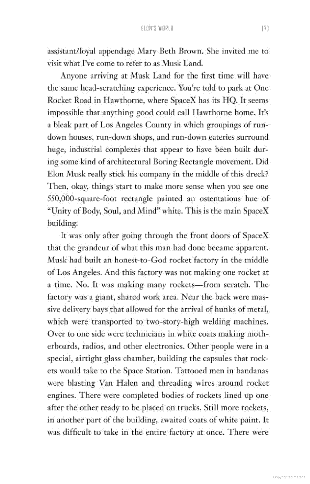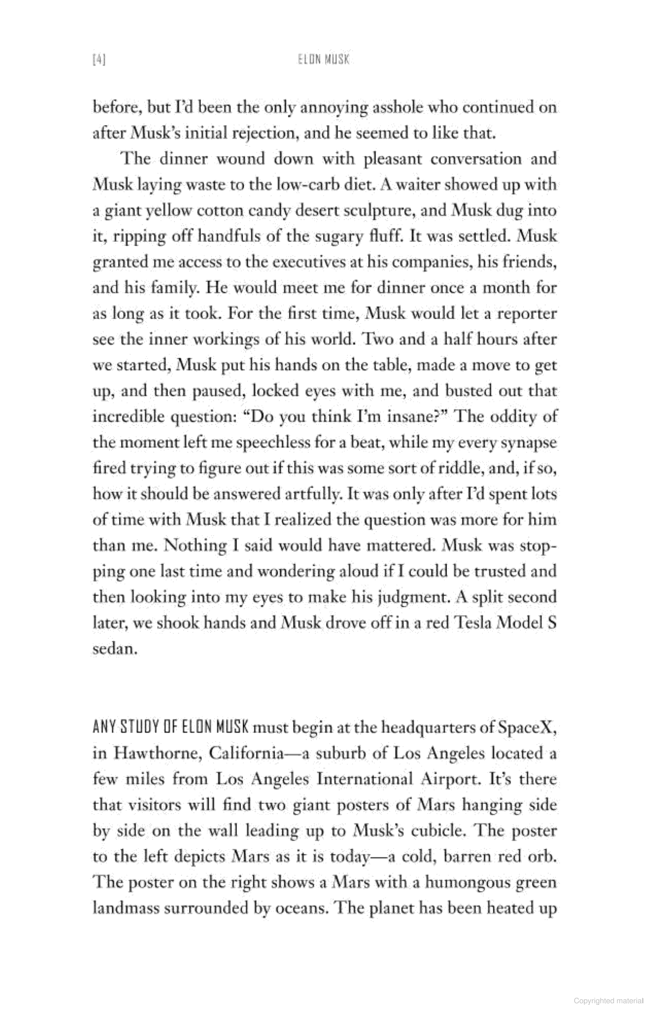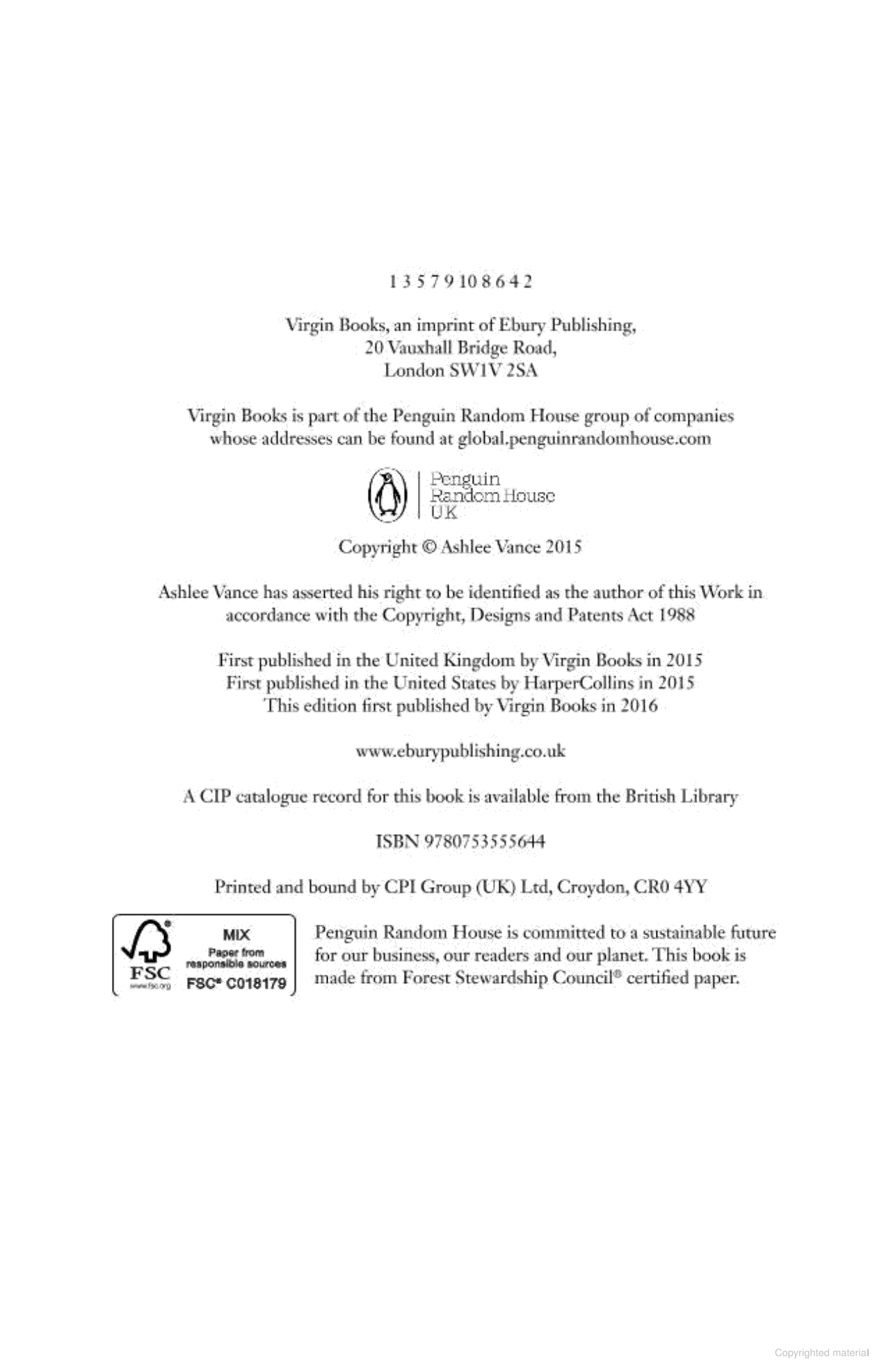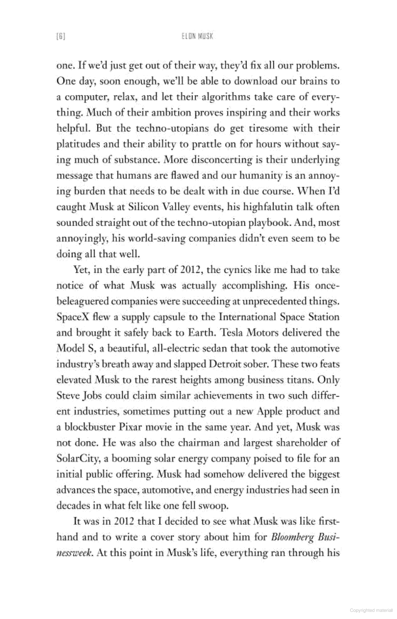 Vance uses Musk's story to explore one of the pressing questions of our time: can the nation of inventors and creators which led the modern world for a century still compete in an age of fierce global competition? He argues that Musk--one of the most unusual and striking figures in American business history--is a contemporary of legendary inventors and industrialists like Thomas Edison, Henry Ford, Howard Hughes, and Steve Jobs. More than any other entrepreneur today, Musk has dedicated his energies and his own vast fortune to inventing a future that is as rich and far-reaching as the visionaries of the golden age of science-fiction fantasy.