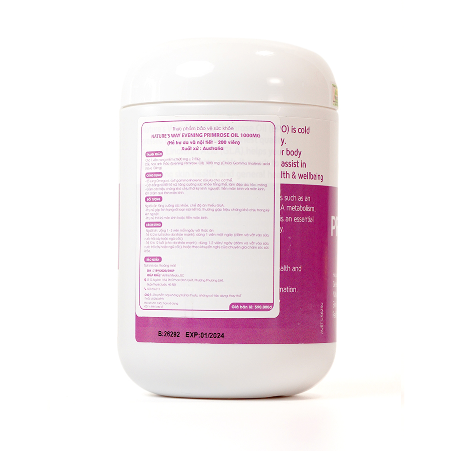 Nature's Way Evening Primrose Oil là sản phẩm được sản xuất từ thành phần tinh dầu hoa anh thảo, mỗi viên chiết xuất đến 1000mg tinh dầu hoa anh thảo đem lại hiệu quả tăng cường sức khỏe, điều hòa nội tiết và ngăn ngừa lão hóa, giúp da khỏe mạnh và nhanh chóng phục hồi.