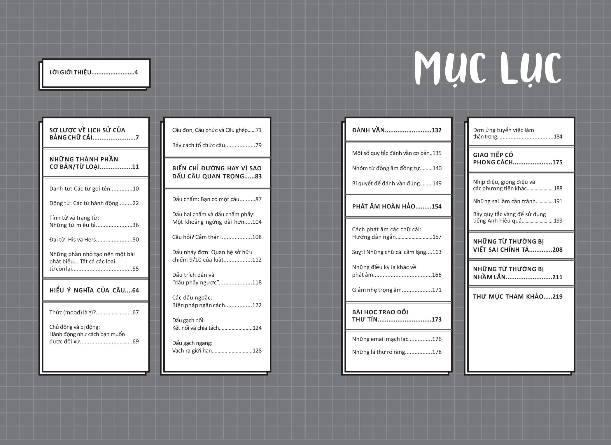 Bắt đầu từ bảng chữ cái, cuốn sách sẽ từng bước khám phá từ những yếu tố cơ bản của tiếng Anh viết và nói – chính tả, trật tự từ, dấu câu, từ loại – cho đến ngữ điệu, những sai lầm cần tránh và bí quyết để đảm bảo tính mạch lạc và thậm chí là tính thanh lịch.