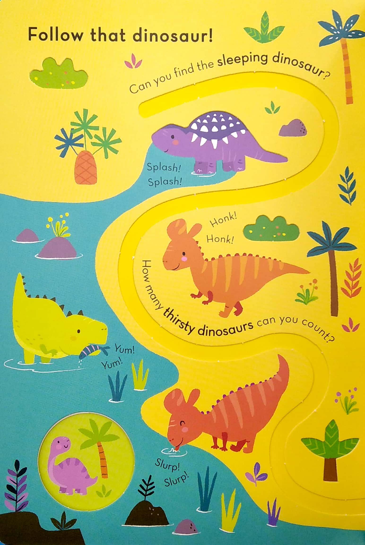 Explore the colourful illustrations as you trace the grooved trails on each page with your fingers and follow the dinosaur through the five different prehistoric scenes. Each scene is full of lots of other stomping, chomping and roaring dinosaurs to spot too. There are die-cuts to find and feel, plus holes lead you through the pages as you follow that dinosaur and find out where he is going!