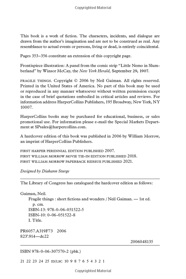 Fragile Things showcases the distinctive storytelling genius that has made Neil Gaiman one of the most admired literary artists of our time. The thirty-two gems of prose and verse in this astonishing collection stretch the imagination and engage the intellect even as they illuminate the vagaries of human experience. Whether he’s conjuring a mysterious traveling circus, exploring the rarefied tastes of an exclusive epicurean club, or visiting a strangely altered Victorian England, Gaiman reveals how the ordinary and the fantastical are transmutable and intertwined.