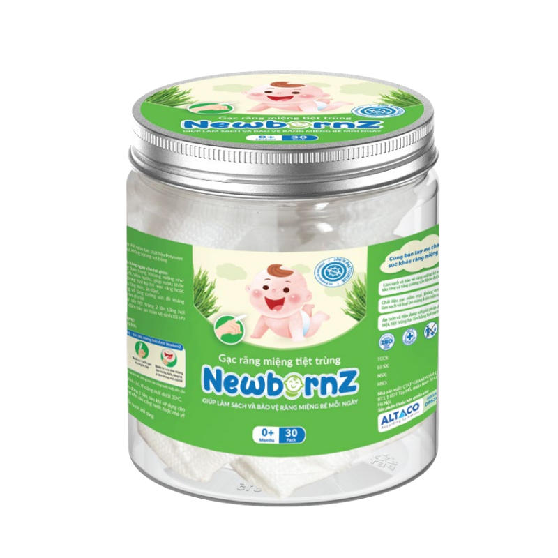 Gạc răng miệng tiệt trùng NewbornZ có thiết thế không tẩm dịch, dạng khô, sử dụng khô hoặc thấm với nước trắng và nước muối sinh lý. Gạc giúp làm sạch cặn thức ăn bám