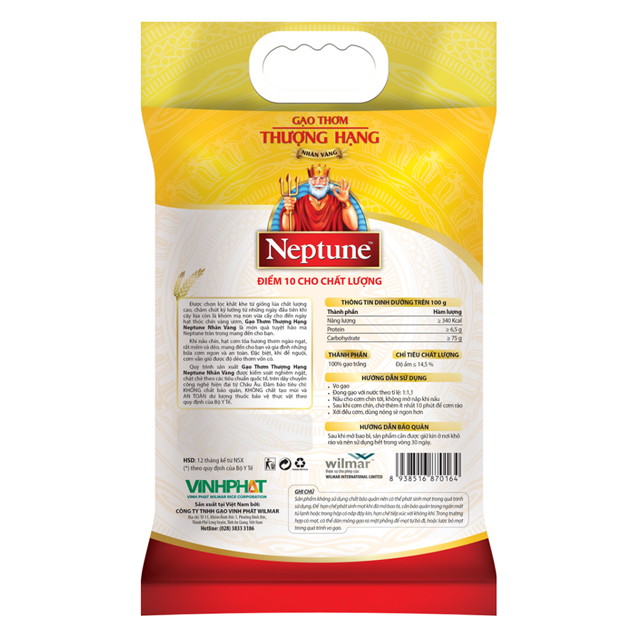 Gạo Thơm Thượng Hạng Neptune Nhãn Vàng 5kg Gạo Thơm Thượng Hạng Neptune Nhãn Vàng 5kg được sản xuất từ những giống lúa chất lượng cao vùng Đồng Bằng Sông Cửu Long. Hạt gạo dài,