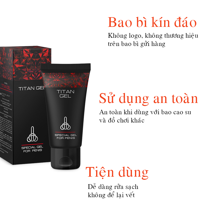 - Nếu bị kích ứng , khó chịu, hoặc phụ thuộc một cách bất thường nên hỏi ý kiến bác sĩ. Trải nghiệm mua hàng của bạn rất quan trọng với Chúng tôi. Chúng tôi tuyệt đối bảo mật thông tin khách hàng, hàng hóa được đóng gói bao bì cẩn thận, không logo, không tên thương hiệu sản phẩm trên bao bì gửi hàng. Gel bôi trơn Titan giúp bạn có được cảm giác thoải mái và yêu thương trọn vẹn hơn. Gel thích hợp sử dụng cùng bao cao su hoặc nhiều bài tập khác. Mua ngay !