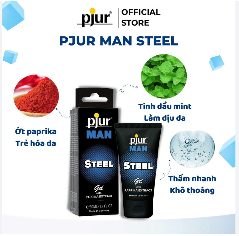 Gel Pjur Man Steel 50ml - Nhập khẩu từ Đức THÔNG TIN SẢN PHẨM: • Đơn vị tính và Quy cách đóng gói: Một hộp 50ml • Nước xuất xứ: sản xuất tại: Đức CÔNG DỤNG: Gel Dưỡng Pjur Man Steel Dành Cho Quý Ông là sản phẩm dành cho nam giới. Chiết xuất từ ớt paprika và tinh dầu bạc hà có tái tạo và tiếp thêm sinh lực và cũng có thể làm trẻ hóa làn da. Tác dụng của ớt bột vừa tăng cường sinh lực vừa kíí và tái tạo làn da. Bạc hà tạo ra cảm giác mát lạnh sảng khoái. HƯỚNG DẪN SỬ DỤNG: Thoa lên cậu nhỏ ngay trước khi qh và xoa bóp mạnh vào da. Trước khi sử dụng hãy thoa kem lên cẳng tay của bạn để kiểm tra xem có bất kỳ phản ứng dị ứng tiềm ẩn nào không. Không sử dụng nếu bạn gặp phản ứng dị ứng. Làm sạch vùng da bị kích ứng bằng nước. Không thoa lên vết thương hở. Hướng dẫn bảo quản: Bảo quản nơi khô ráo nhiệt độ dưới 35°C tránh tiếp xúc trực tiếp với ánh nắng mặt trời.