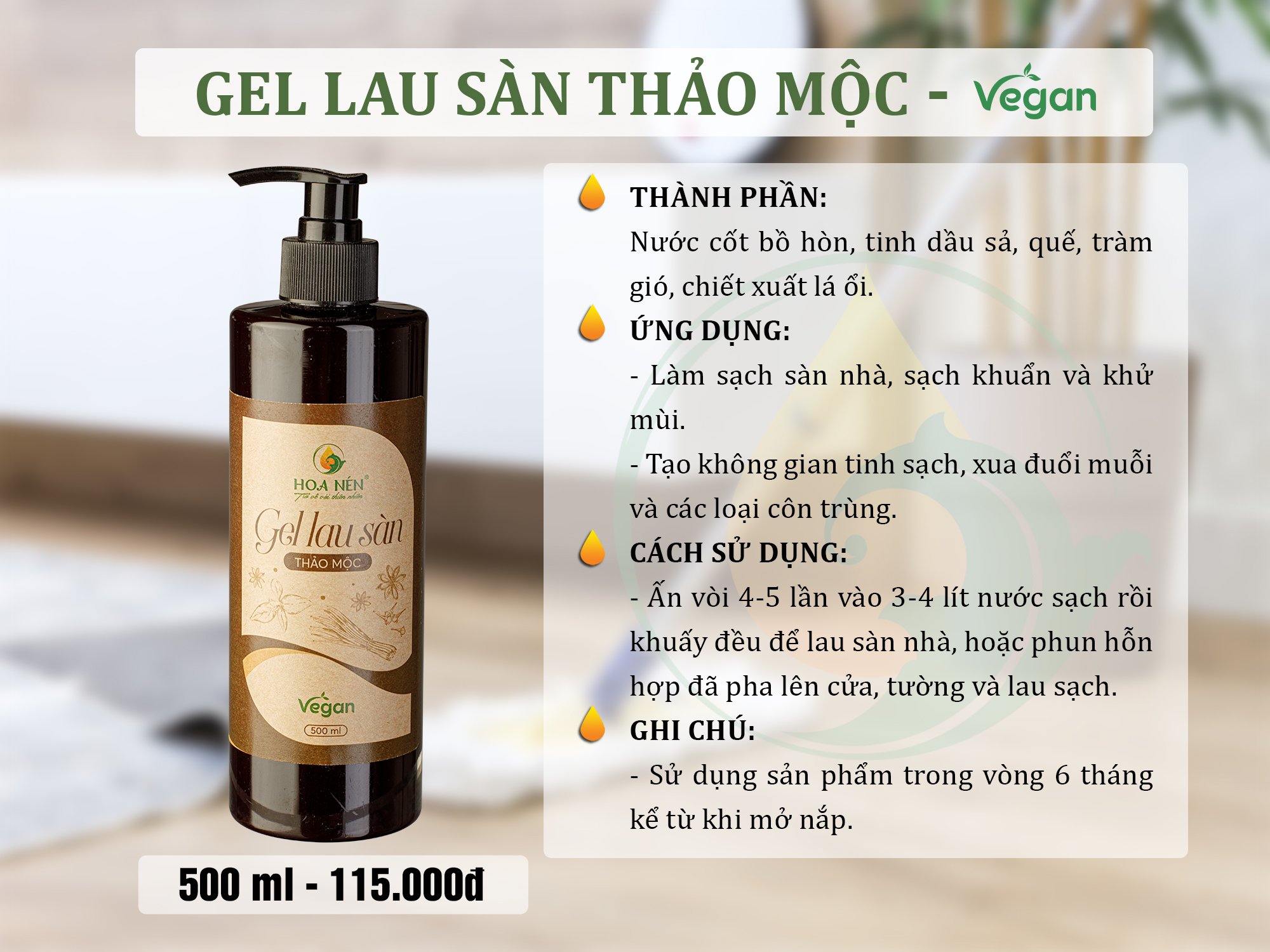 - Hạn sử dụng: 36 tháng SẢN PHẨM THUẦN CHAY MỚI - DÀNH CHO MỌI NHÀ Hoa Nén ra mắt các sản phẩm mới theo chuẩn Vegan: Gel_lau_sàn_thảo mộc_tự_nhiên - chiết xuất từ các thành phần thiên nhiên như nước cốt bồ hòn, tinh dầu sả, quế,tràm gió, chiết xuất lá ổi,... với khả năng làm sạch, diệt khuẩn , khử mùi ưu việt. ỨNG DỤNG CỦA GEL LAU SÀN THẢO MỘC TỰ NHIÊN: Làm sạch sàn nhà, sạch khuẩn và khử mùi. Dùng được cho sàn gỗ và các bề mặt tủ, bàn ghế, cửa kính và các vật dụng trong gia đình; Tạo không gian tinh sạch, xua đuổi muỗi và các loại côn trùng; Hương thơm tinh dầu tự nhiên, thăng hoa cuộc sống, an toàn với sức khỏe và thân thiện với môi trường. Không giống như những dòng sản phẩm thông thường khác trên thị trường, Gel lau sàn thảo mộc tự nhiên của Hoa Nén không chỉ đáp ứng nhu cầu của người tiêu dùng, mà còn thân thiện với môi trường, không thử nghiệm trên động vật. Gel lau sàn tự nhiên chính là tham gia vào công cuộc sống xanh và bảo vệ sức khỏe của gia đình chúng ta mỗi ngày. Vậy nên, hãy lựa chọn những sản phẩm thuần chay cùng Hoa Nén bạn nhé!!! CÁCH SỬ DỤNG: Ấn vòi 4-5 lần vào 3-4 lít nước sạch rồi khuấy đều để lau sàn nhà hoặc phun hỗn hợp đã pha lên cửa,tường và lau sạch. GHI CHÚ: Sử dụng sản phẩm trong vòng 6 tháng kể từ khi mở nắp CAM KẾT: