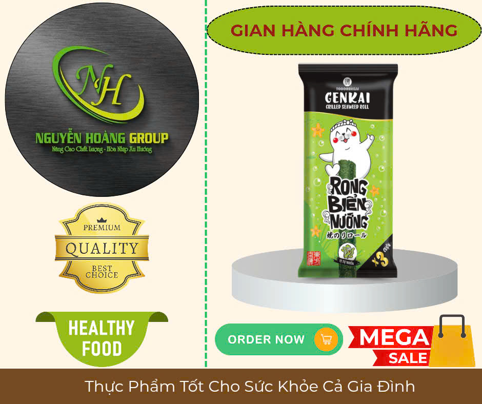 Tên sản phẩm: RONG BIỂN NƯỚNG CUỘN Có 2 Vị : Tự Nhiên & Vị Cay NÓNG Thành phần: Rong biển 68%, dầu ngô 26.7%, dầu mè 4.3%, muối biển 1% Lá Rong biển có