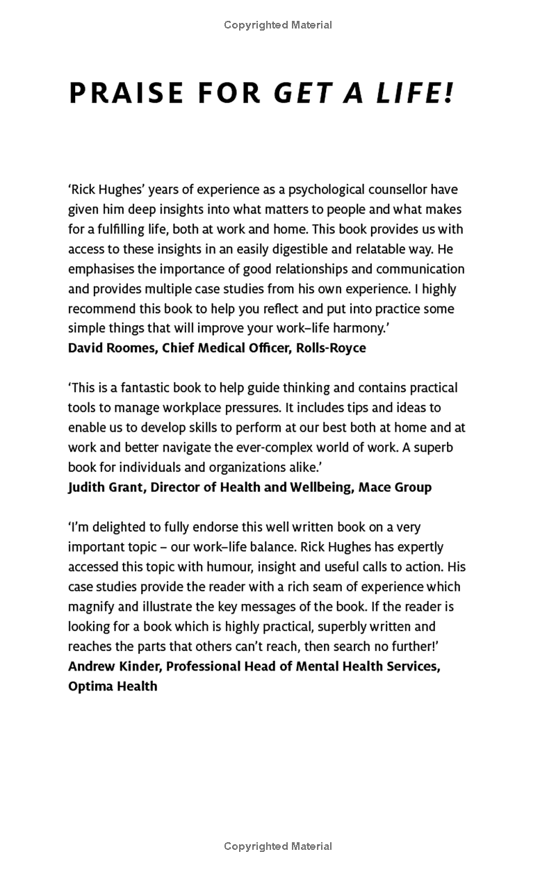 Written by experienced coach, counsellor and wellbeing consultant Rick Hughes, this book covers everything from assessing your own needs, delegation and workload management and the myths of perfectionism, to managing and investing in relationships at work and at home, considering professional and personal development, and creativity and self-worth. With a wealth of advice, case studies and useful action plans founded in over 25 years of real-world experience, Get A Life! will help you find the balance that works for you, now.