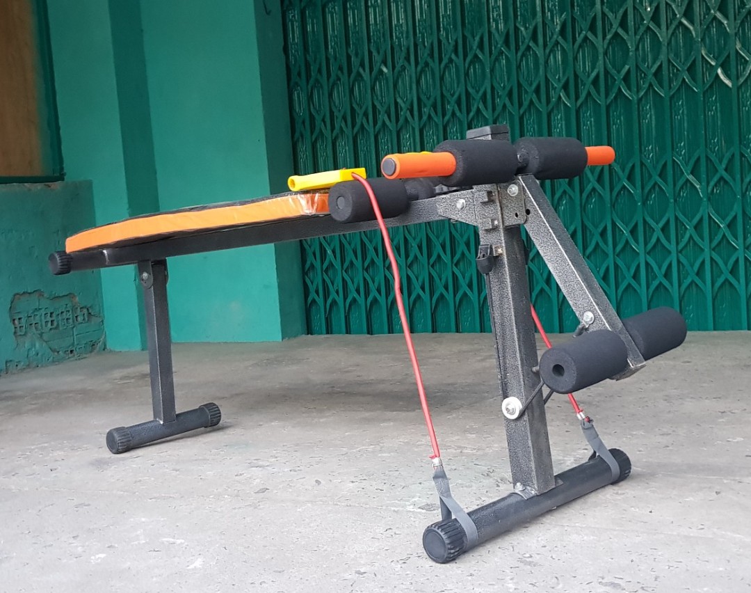 HƯỚNG DẪN SỬ DỤNG 1/ Tập bụng trên: Ngồi vào ghế như hình móc 2 chân vào đệm cao su, nằm thẳng người xuống, hít hơi vào dùng sức nâng người lên lúc này thở ra. Ngồi như tư thế trên, khi xuống kết hợp vặn người sang trái (hoặc phải) để tập eo. 2/ Tập bụng dươi: Nằm ngửa, 2 tay bám vào đệm cao su, 2 chân duỗi thẳng nâng lên cao, thóp bụng, hít hơi vào lại rồi hạ xuống từ từ không chạm đất, lúc này thở ra . Rồi lập lại như trên nhiều lần. 3/ Tập vai tay trước: Ngồi móc chân vào đệm cao su, hai tay nắm đầu dây, kéo căng lực dây ra 2 bên, lập đi lập lại nhiều lần. 4/ Tập hít đât: Hai tay nắm vào đầu mút. Người ngã về hướng ghê, hai khuỷu tay gấp lại đồng thời hít vào. Dùng lực cổ tay, cánh tay, đẩy thân người nhô lên, thở ra. Lập lại nhiều lần. 5/ Tập ngực trên Ghế với tạ: Nằm ngữa trên ghế: 2 chân móc vào cao su, 2 tay nâng tạ lên cao, tập ngực và tay sau. 6/ Tập cơ lưng tư thế nằm sấp: Nằm sấp 2 chân cài vào đệm cao su, 2 tay đặt sau gáy, nâng người lên. Tập cơ lưng khòe dẻo dai.