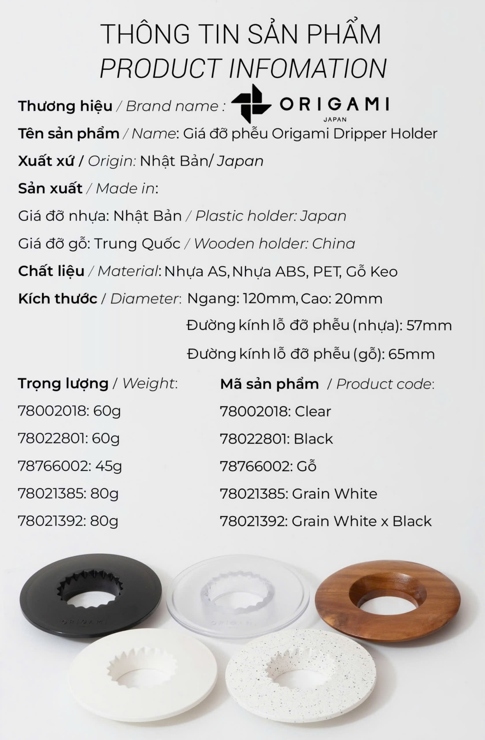 Đế gỗ cho phễu Origami Đế gỗ đặt phễu Origami là phụ kiện không theo kèm trong hộp phễu lọc Origami sứ hoặc nhựa. Trên thực tế, phụ kiện này góp phần tạo nên sự