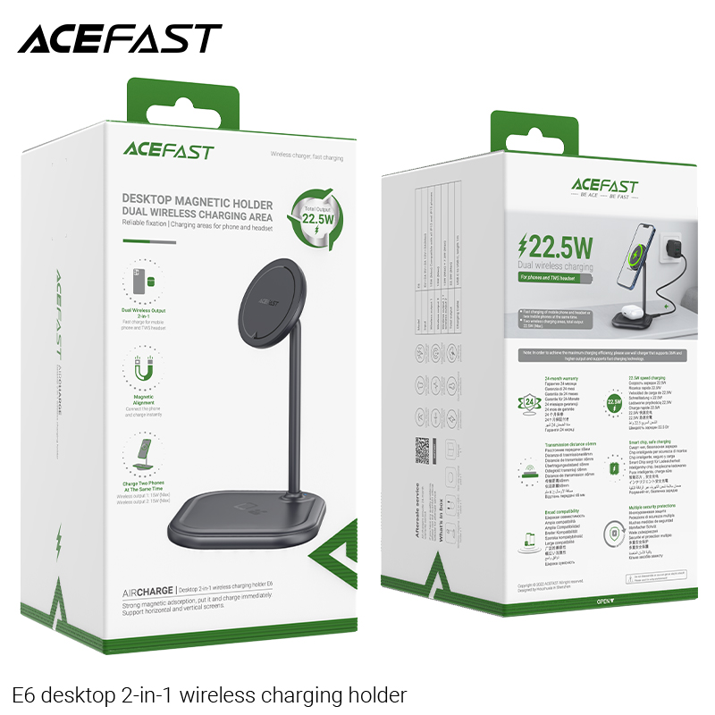 Mua tại Tiktok*Lưu ý: Đế sạc phù hợp với các thiết bị có hỗ trợ sạc không dây, riêng chức năng sạc mag.safe chỉ hỗ trợ cho các dòng từ i.phone 12 series trở lên và các dòng tai nghe có hỗ trợ sạc mag.safe. Lực hút từ tính chỉ hỗ trợ tốt khi sử dụng ốp lưng có độ dày <=5mm Giá đỡ sạc không dây để bàn 2 in 1 ACEFAST E6 Thông số kỹ thuật: - Input : 5V/ 2A, 9V/ 2A, 12V/ 3A. - Output1: 15W (for mag.safe 7.5W). Output2: 15W Output 1+2: 15W + 7.5W Tổng công suất: 22.5W
