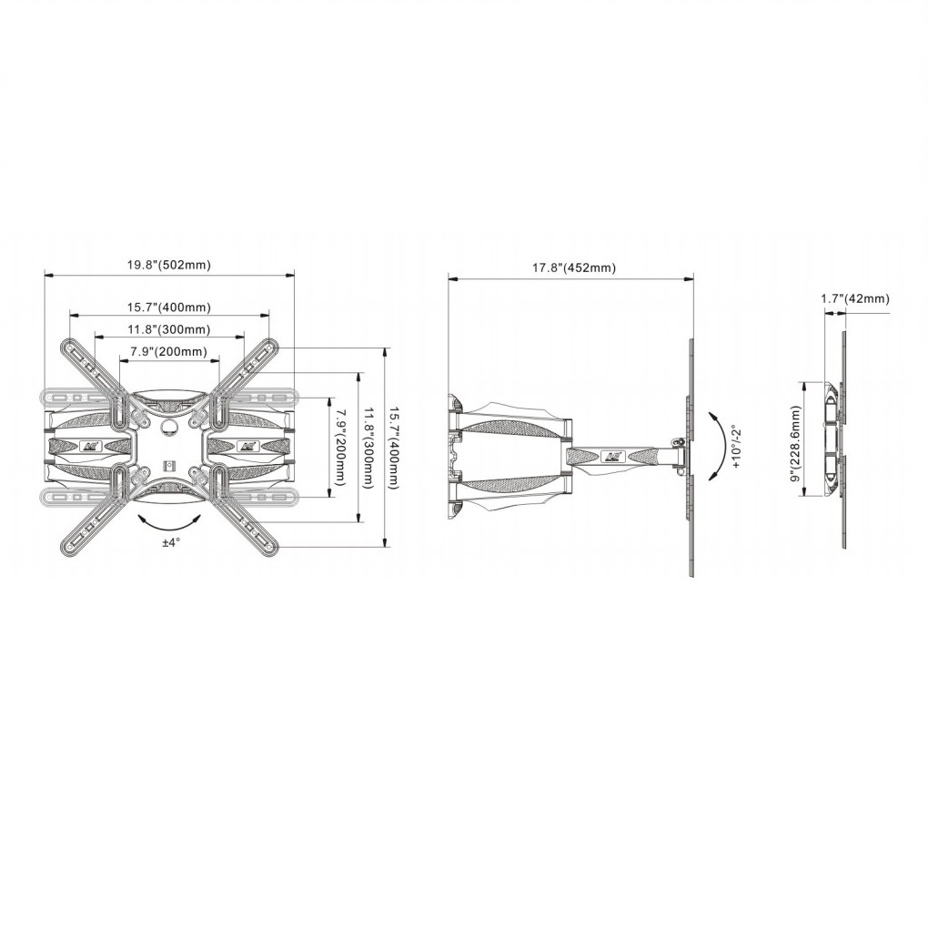 Thông số kĩ thuật - Vesa: 400x400 mm - Xoay 180 độ tại các khớp nối - Thiết kế kẹp nhựa đế nẹp dây điện - Khoảng cách kéo dãn tối đa: 468mm - Thu