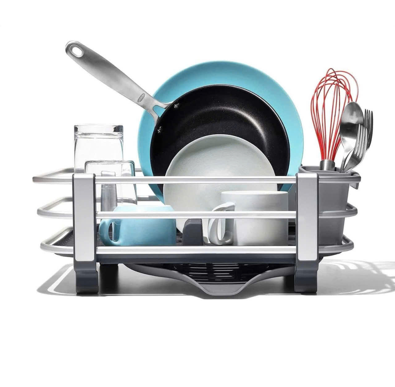 Giá để bát đĩa khung nhôm OXO Good Grips kết hợp tính linh hoạt của một bệ thiết kế mở với độ bền của khung nhôm. Tấm thoát nước có thể điều chỉnh và cốc đựng đồ dùng có thể tháo rời cho phép bạn kiểm soát mặt bàn bếp của mình. Và với giá để đĩa độc đáo, phần giữa mở và khung chắc chắn, Giá để bát đĩa này có thể đựng mọi thứ từ bát đĩa , nồi chảo, thìa dĩa,....