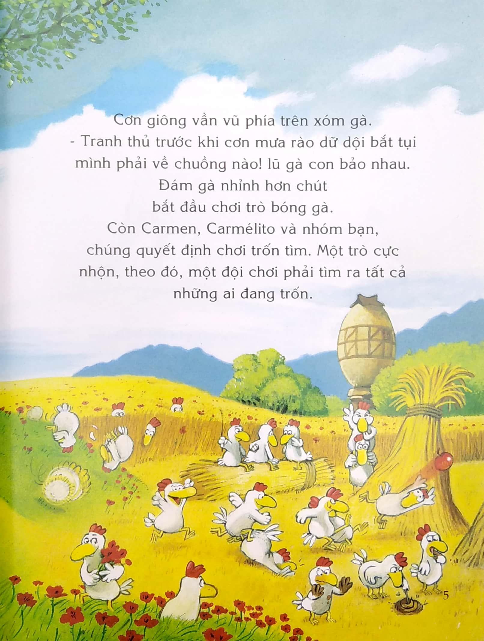 Đám gà giò lời qua tiếng lại, bạt tai, giật mào, thụi thẳng cánh và cuối cùng là ẩu đả, trong khi ba con cáo nhí đáng sợ đã bắt cóc Carmentino cùng các bạn.
