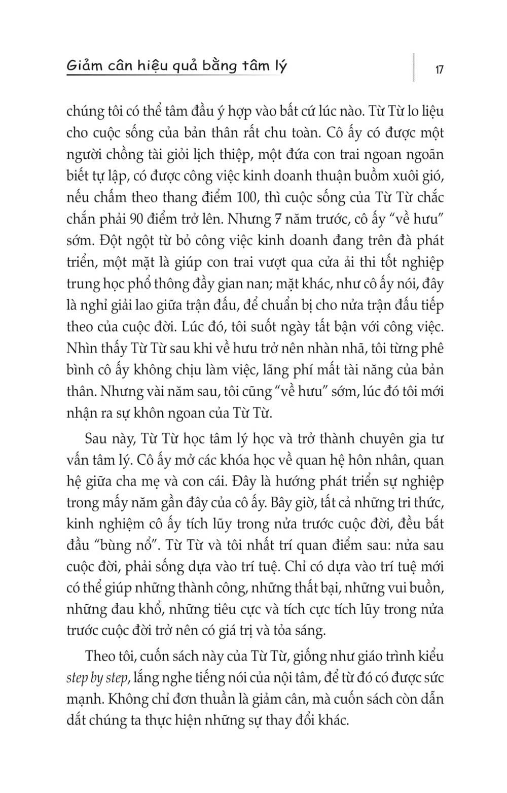 Nếu giảm cân không chỉ đơn thuần là giảm bớt cân nặng, mà là để thúc giục bạn nhìn nhận lại bản thân, đốc thúc bạn nhìn vào những sự thật bạn không muốn nhìn, giải quyết những vấn đề bạn không dám đối mặt, thì một thân hình quá khổ thực chất là món quà của Thượng đế ban tặng, muốn bạn thông qua giảm cân để trưởng thành. Giảm cân không đơn giản, nó không phải là cuộc chiến với lượng mỡ dư thừa, mà là cuộc giao chiến trực diện với nỗi sợ hãi trong nội tâm. Tôi đã từng thử sức, mặc dù không dễ, nhưng thành quả của thắng lợi lại hết sức ngọt ngào. Cũng giống như rất nhiều sự kiện trong cuộc đời này, sai lầm của chúng ta là ở chỗ coi những việc cần phải làm “suốt đời” là những việc mang tính nhất thời. Giảm cân cũng như thế, hôn nhân cũng như thế, học tập cũng như thế. Giảm cân cấp tốc trong khoảng thời gian ngắn là sự cám dỗ, đồng thời cũng là cạm bẫy. Nguyên nhân gây ra các vấn đề trong việc kiêng ăn để giảm cân không phải là hướng đi sai, mà là tốc độ quá nhanh. Rất nhiều phụ nữ có vấn đề về cân nặng đều có chung một nhân tố tâm lý khiến cho họ béo: không phân biệt rõ trách nhiệm của bản thân và trách nhiệm của người khác. Sự thoải mái nhẹ nhõm sau khi chấp nhận bản thân có tác dụng chữa trị cho cả tinh thần lẫn thể xác. Nó giúp chúng ta tràn đầy tự tin, nhận thức được giới hạn khả năng của chính mình, từ đó không khắt khe với người khác, cũng không khắt khe với bản thân.