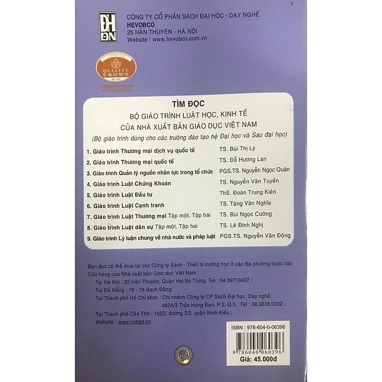 Mua tại TiktokTên sách: Giáo trình Luật sở hữu trí tuệ Tác giả: Lê Đình Nghị, Vũ Thị Hải Yến (đồng chủ biên), Nguyễn Như Quỳnh, Nguyễn Thị Tuyết Số trang: 196 Khổ sách: 16.0 x 24.0 Năm tái bản: 2017 Nhà xuất bản: NXB Giáo dục VN Công ty phát hành: Công ty CP Sách Đại học - Dạy nghề Nội dung : Để đáp ứng nhu cầu nghiên cứu, giảng dạy và học tập của giảng viên, sinh viên, học viên và những người quan tâm, Bộ môn luật dân sự (Khoa học dân sự) Trường Đại học Luật Hà Nội đã biên soạn giáo trình luật sở hữu trí tuệ Việt Nam. Việc biên soạn giáo trình này dựa trên cơ sở các quy định của Luật sở hữu trí tuệ và các văn bản hướng dẫn thi hành đồng thời cũng đảm bảo tính phù hợp với chương trình khung của Bộ giáo dục và đào tạo.
