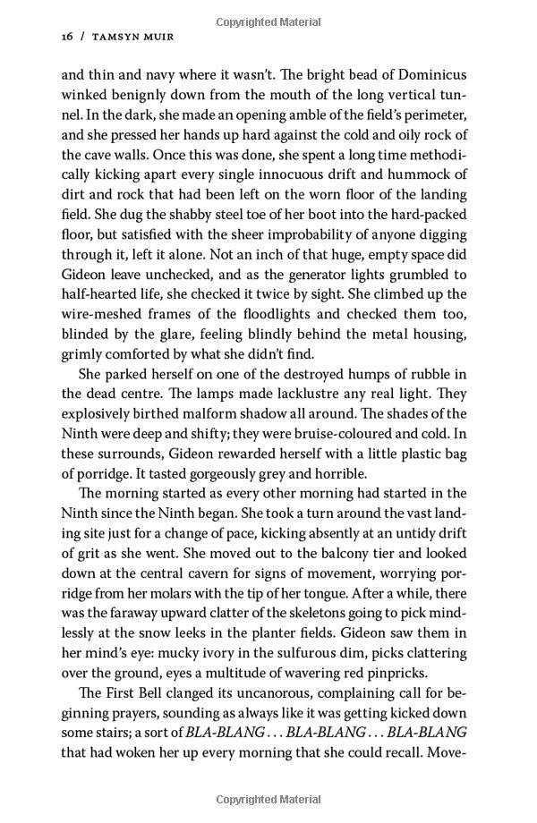 The Emperor needs necromancers. The Ninth Necromancer needs a swordswoman. Gideon has a sword, some dirty magazines, and no more time for undead bull****. Tamsyn Muir s Gideon the Ninth unveils a solar system of swordplay, cut-throat politics, and lesbian necromancers. Her characters leap off the page, as skillfully animated as arcane revenants. The result is a heart-pounding epic science fantasy. Brought up by unfriendly, ossifying nuns, ancient retainers, and countless skeletons, Gideon is ready to abandon a life of servitude and an afterlife as a reanimated corpse. She packs up her sword, her shoes, and her dirty magazines, and prepares to launch her daring escape. But her childhood nemesis won t set her free without a service. The emperor has called his necromancers to action, and Harrowhark is set on Gideon attending her as bodyguard. If Gideon survives, she ll be a hero, and a free woman. If not, she can look forward to eternity as a shambling bone-servant.