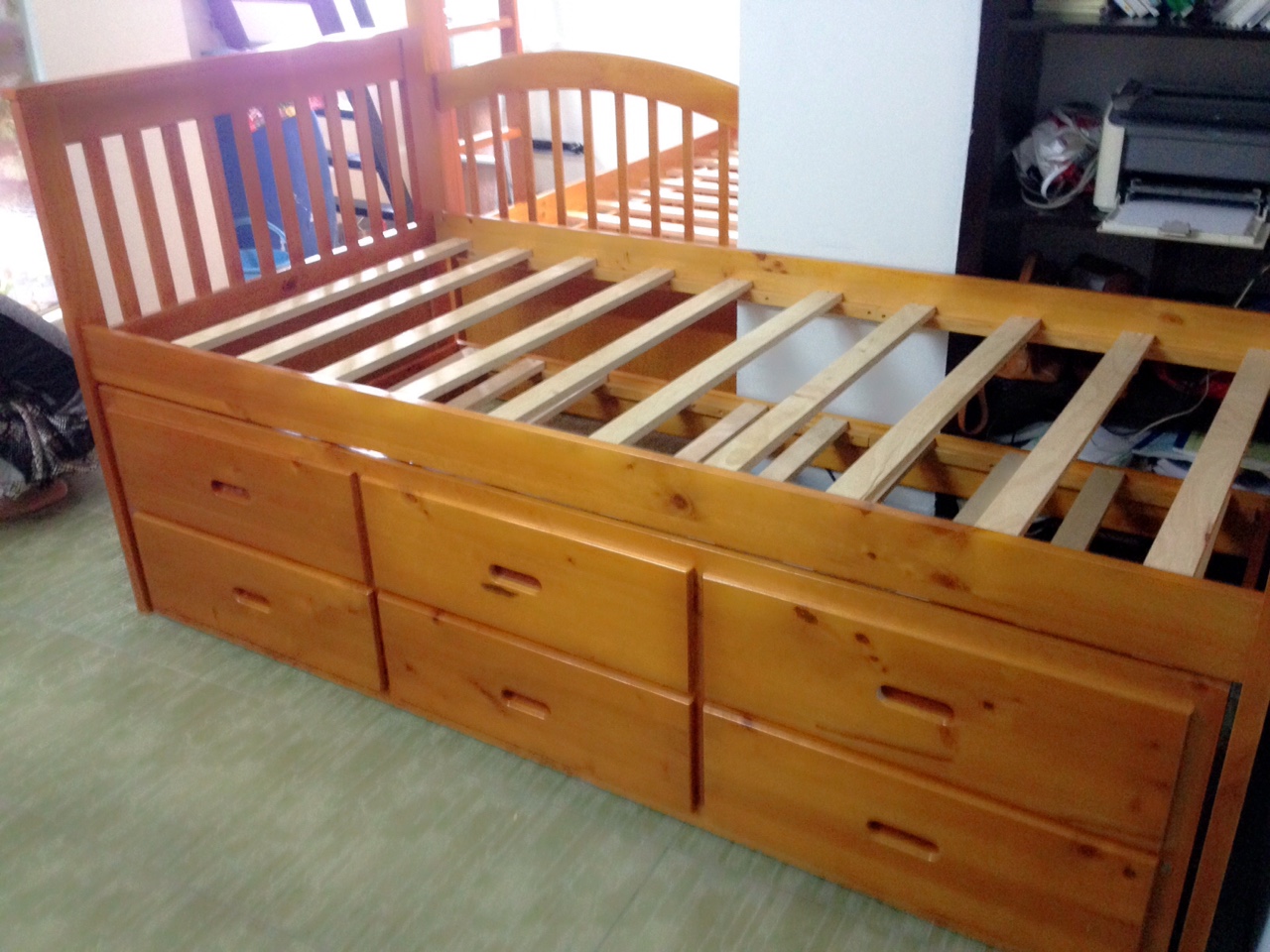 + Chất liệu: Khung giường gỗ thông Newzealand, phân tầng, Vách, đáy hộc gỗ công nghiệp, thang giường MDF chịu lực + Kích thước: kích thước phủ bì, tầng trên ưới 1mx2m Giường tầng hộp
