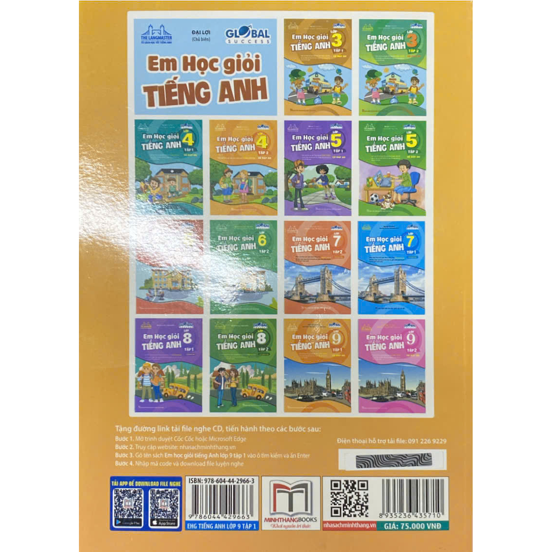 Giới thiệu sách GLOBAL SUCCESS - Em học giỏi tiếng anh lớp 9 tập 1 (Có đáp án) Bộ sách được biên soạn rất công phu, kỹ lưỡng và tâm huyết của các giáo viên, giảng viên có nhiều kinh nghiệm giảng dạy ở các trường chuyên Anh. Bộ sách được chia thành 2 tập: Tập 1: từ Unit 1 đến Unit 6 Tập 2: từ Unit 7 đến Unit 12 Với mỗi bài học, chúng tôi đều biên soạn theo ba phần kiến thức cơ bản: Lý thuyết, thực hành ngôn ngữ và thực hành kỹ năng. Phần Lý thuyết kiến thức ngôn ngôn Phần Thực hành ngôn ngữ được trình bày một cách chi tiết, khoa học theo ba phần: Từ vựng–Ngữ âm–Ngữ pháp giúp các em vận dụng các kiến thức trong phần Lý thuyết. Phần Thực hành kỹ năng: Các bài tập được biên soạn theo từng bài học có nội dung tương ứng với bài học trong sách giáo khoa giúp các học sinh thực hành kỹ năng Nghe–Nói–Đọc– Viết.