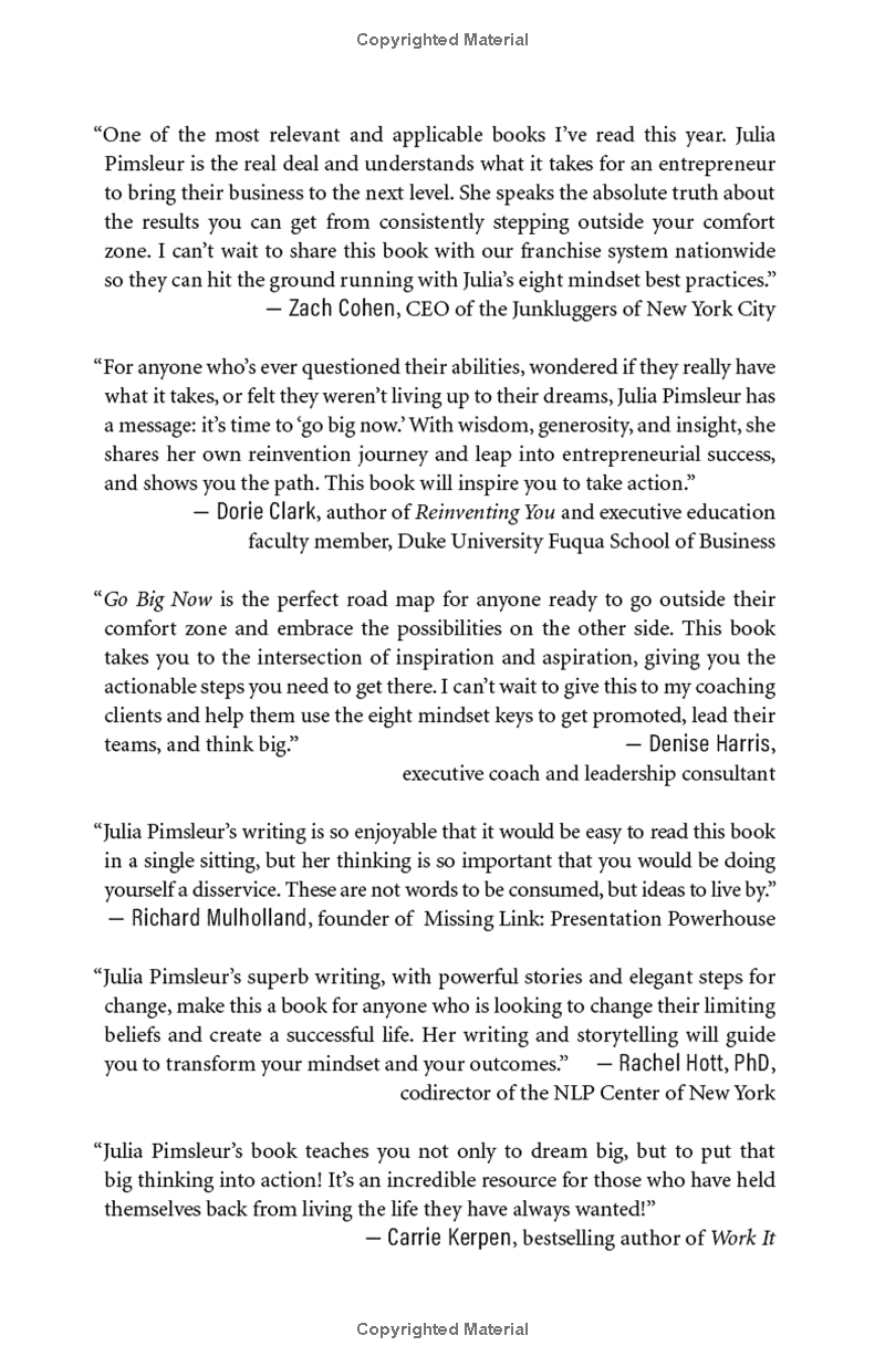 What’s the biggest challenge you face if you want to accomplish great things? It’s getting and keeping the right mindset, according to the hundreds of high achievers Julia Pimsleur has interviewed and worked with as a business coach. In Go Big Now, Pimsleur distills two decades of studying complex mindset practices into eight essential “mindset keys” that can be used by anyone to get the Go Big Mindset and achieve ambitious professional and life goals. Pimsleur shares personal stories of how she used these keys to raise venture capital and build multimillion-dollar companies, and illustrates each key with an example from a leader, CEO, or celebrity whose mindset catapulted them to success. You’ll learn to reframe perceived setbacks, replace unhelpful thoughts and limiting beliefs with empowering ones, and stay motivated to pursue your big goal, even in the face of massive hurdles. With the Go Big Mindset, you’ll boost your mental resilience and discover how to think your way to bigger, better results.