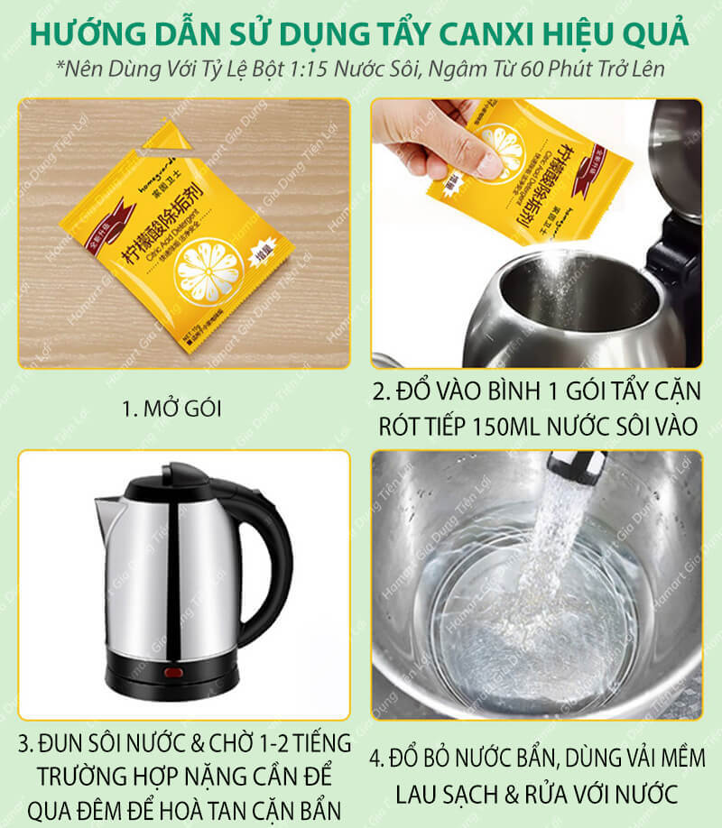 - Đổ 1 gói tẩy cặn canxi 10g dạng hạt vào phích nước hoặc ấm siêu tốc, thêm khoảng 150ml nước nóng ~80 độ hoặc đun sôi nước