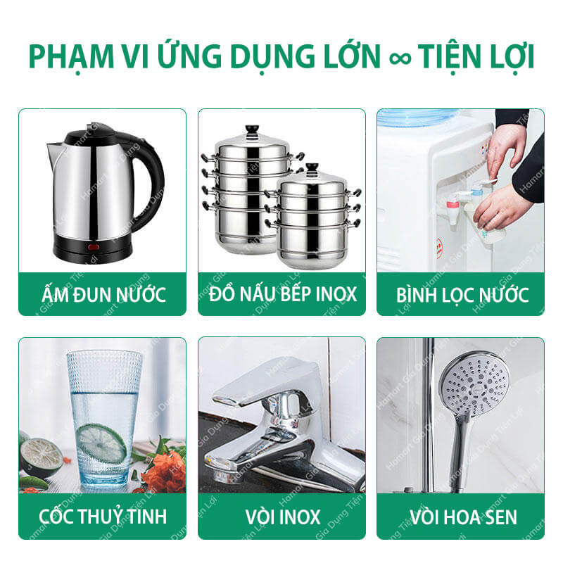 - tẩy cặn can xi trên mặt inox như: sen vòi, bình đun nước, que đun bình nóng lạnh,