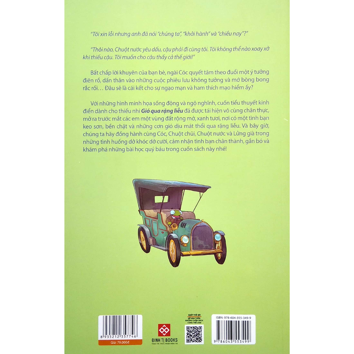 • Với những hình minh họa sống động và ngộ nghĩnh, cuốn tiểu thuyết kinh điển dành cho thiếu nhi Gió qua rặng liễu đã được tái hiện vô cùng chân thực, mở ra trước mắt các em một vùng đất rộng mở, xanh tươi, nơi có một tình bạn keo sơn, bền chặt và những cơn gió dịu mát thổi qua rặng liễu. Và bây giờ, chúng ta hãy đồng hành cùng Cóc, Chuột chũi, Chuột nước và Lửng già trong những tình huống dở khóc dở cười, cảm nhận tình bạn chân thành, gắn bó và khám phá những bài học quý báu trong cuốn sách này nhé!
