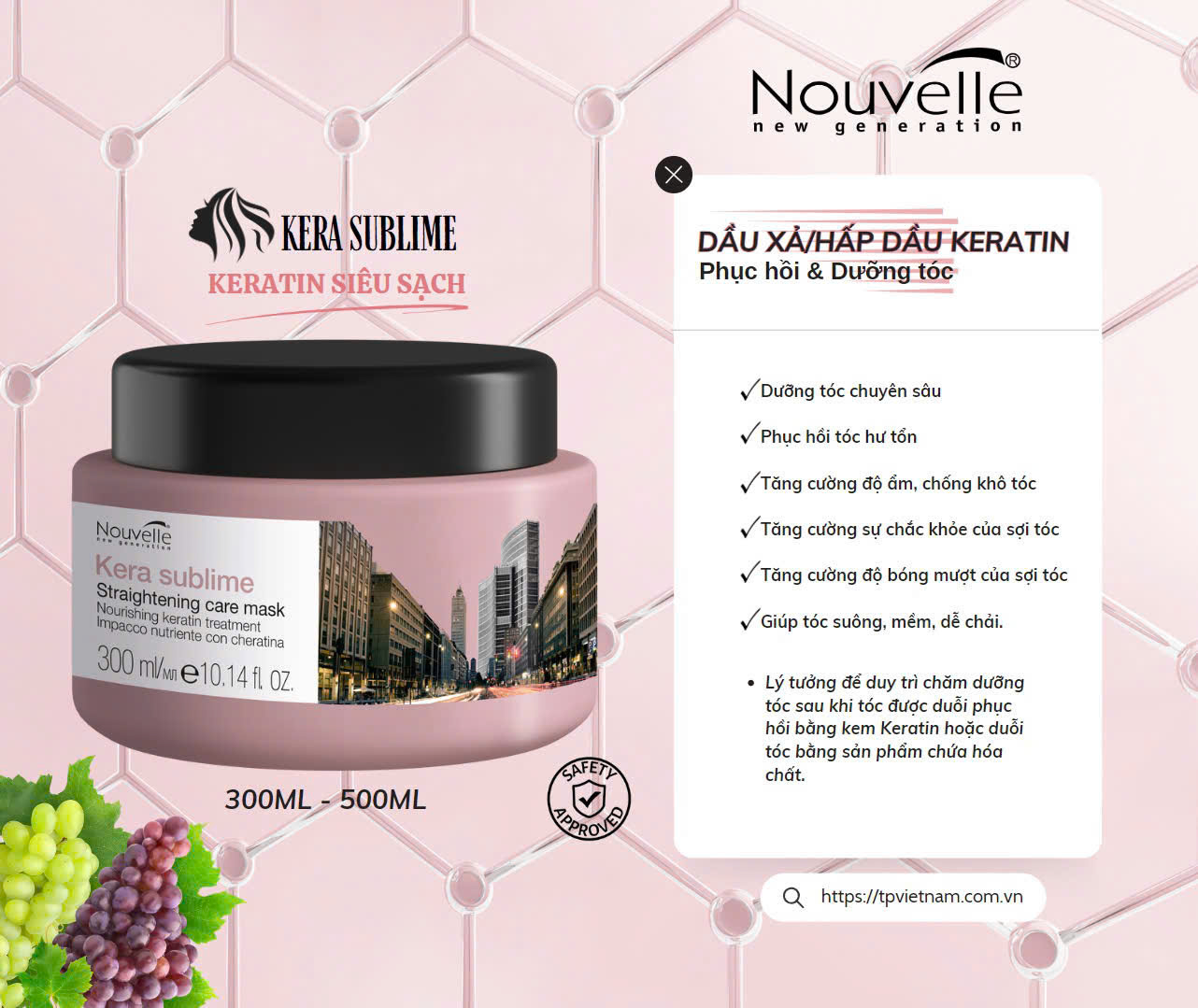 Mua tại TiktokCông dụng: Nuôi dưỡng tóc, cân bằng độ ẩm, tăng cường sự chắc khỏe và bóng mượt cho tóc nhờ sự hoạt động hiệu quả của sự kết hợp các thành phần keratin và tinh dầu hạt nho trong sản phẩm. Giúp tóc suông mềm và dễ chải. Cách sử dụng:Sau khi gội đầu, lau ráo tóc, thoa sản phẩm lên tóc, chải tóc cho sản phẩm phân bố đều, để khoảng 3 - 5 phút rồi xả sạch. Dung tích: Hũ 300ml