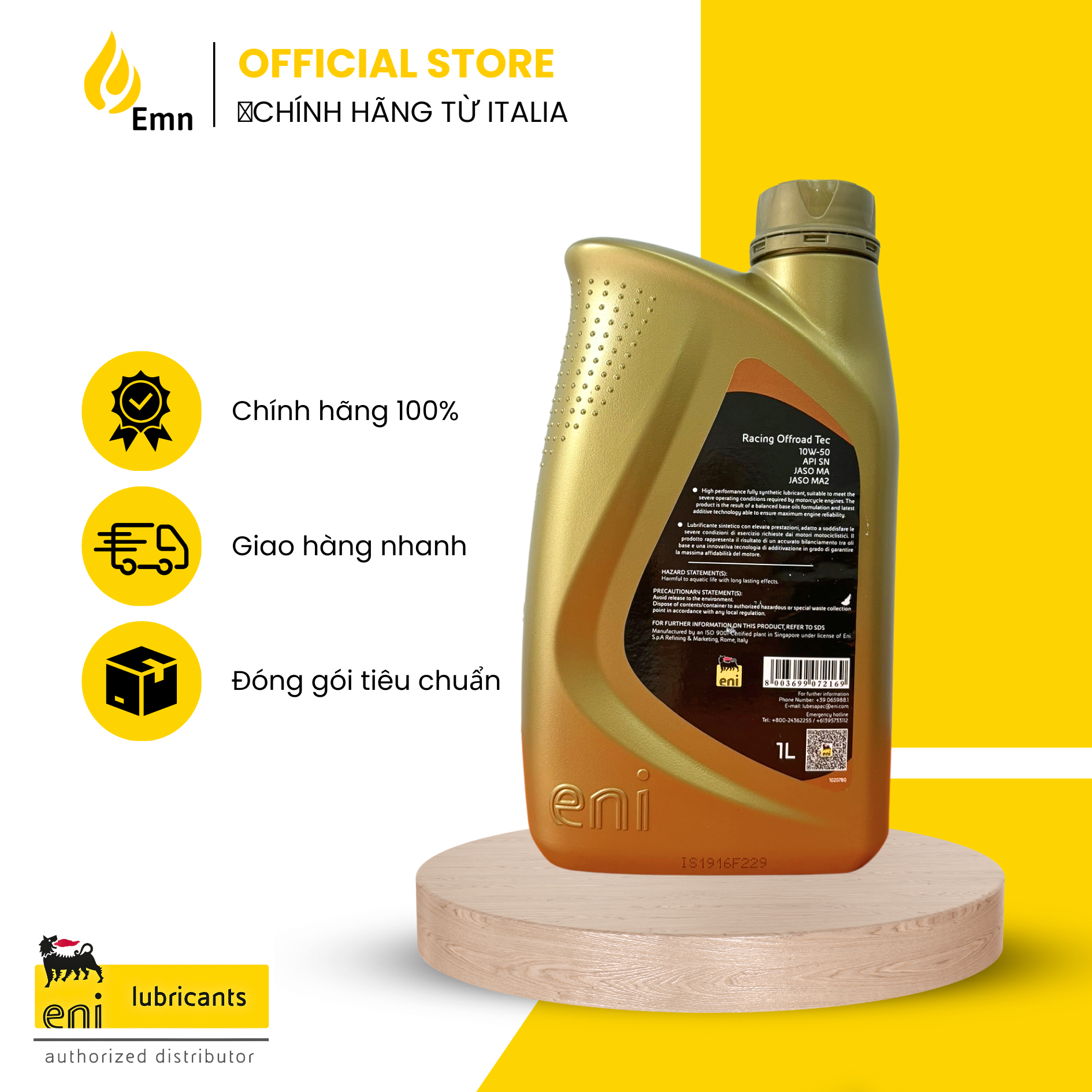 Mua tại TiktokEni Racing OffRoad 10W50 là dầu nhớt bôi trơn động cơ tổng hợp hoàn toàn hàng đầu với công thức được thiết lập và phát triển để đáp ứng các yêu cầu bôi trơn cho động cơ 4 thì tiên tiến được trang bị trong các xe offroad (cào cào). Tính chất . Cấp nhớt: JASO MA, MA2 | API SN . Chỉ số nhớt: 160 . Phân loại: Nhớt tổng hợp toàn phần (Fully Synthetic) Đặc tính . Hạn chế sự trượt của ly hợp tối đa, giúp cho xe vận hành hết công suất, kể cả trong môi trường xấu . Khả năng làm sạch động cơ, không để lại cặn bẩn trong khoang máy . Đáp ứng nhiệt độ cao và hiệu suất làm việc lớn Ứng dụng . Sử dụng cho hầu hết các xe phân khối lớn, đặc biệt là phân khúc Offroad (cào cào) . Khuyến khích sử dụng cho các dòng xe đã sử dụng thời gian lâu