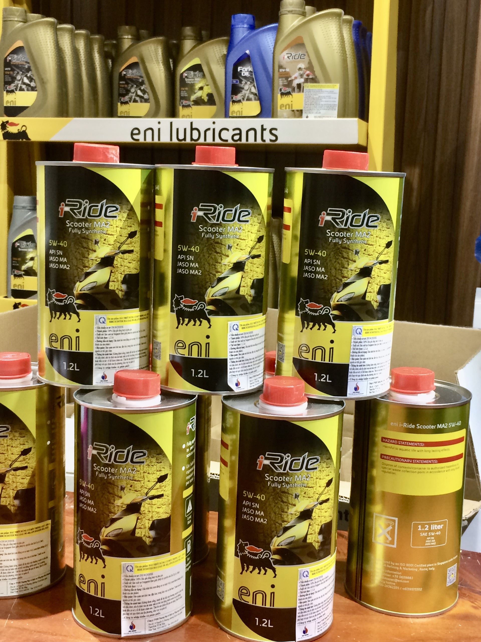 ENI I-RIDE SCOOTER MA2 5W-40 là dầu nhớt bôi trơn tích hợp sự đổi mới trong công nghệ pha chế từ nghiên cứu của các chuyên gia Eni trong lĩnh vực dầu nhờn). Tính chất . Cấp nhớt: JASO MA, MA2 | API SN . Phân loại: Nhớt tổng hợp toàn phần (Fully Synthetic) Đặc tính . Khả năng bôi trơn vượt trội, chống mài mòn hiệu quả. . Khả năng làm sạch động cơ, không để lại cặn bẩn trong khoang máy. . Khả năng chịu được nhiệt độ cao mà không làm giảm công suất. . Khả năng tăng tốc cực nhạy, đáp ứng mọi tình huống. . Chống oxy hóa cao, đảm bảo tuổi thọ của động cơ. . Tiết kiệm nhiên liệu và bảo vệ môi trường. Ứng dụng . Sử dụng được cho hầu hết các loại xe: xe ga và xe số động cơ 4 thì. . Khuyến khích cho các dòng xe có hiệu suất cao. . Được đề xuất sử dụng cho hãng xe Vespa của Piaggio.