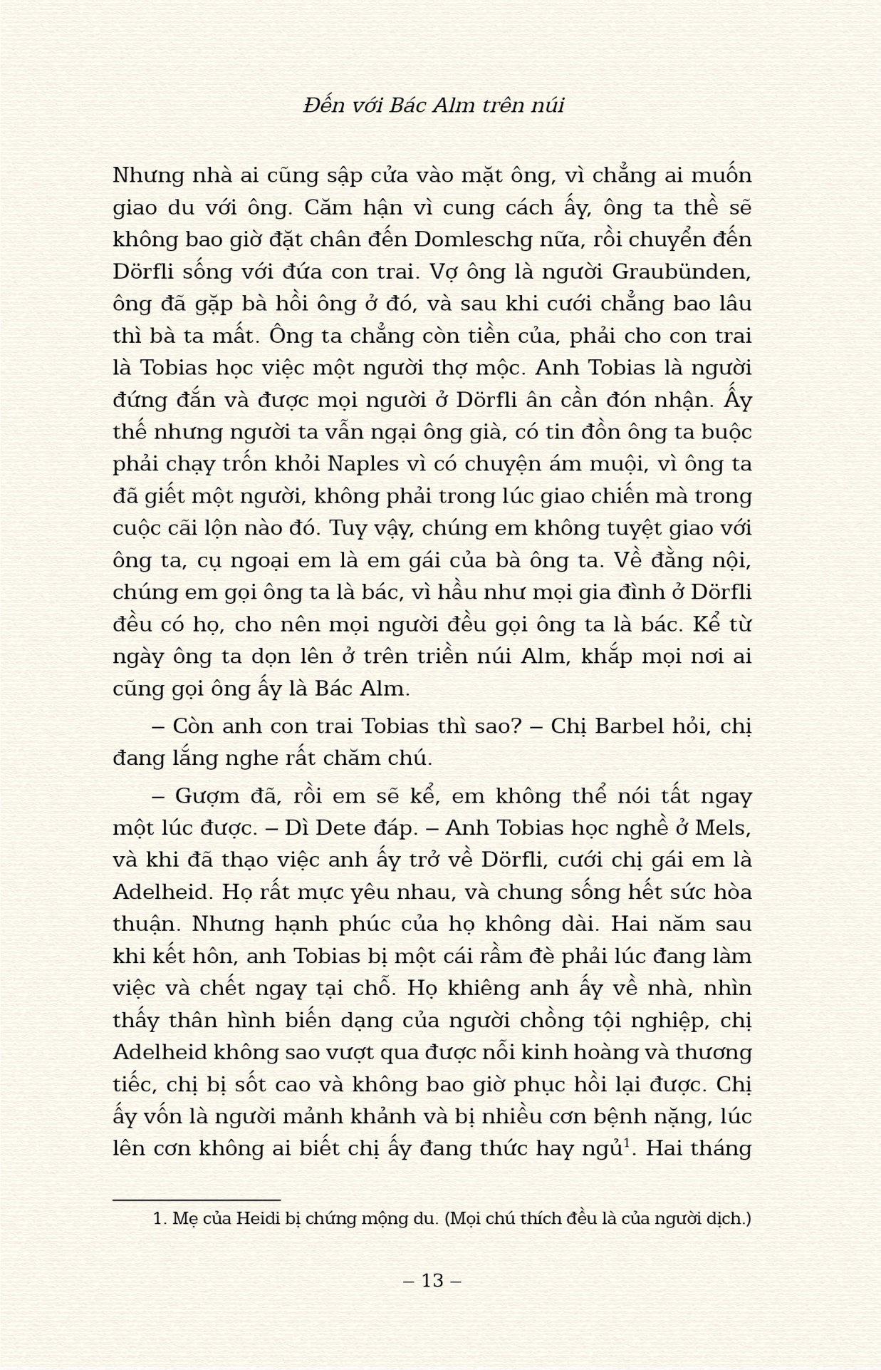Cuốn sách kinh điển của Johanna Spyri đã được Đông A xuất bản với bản dịch được yêu thích của dịch giả Thanh Vân, minh họa của Elena Selivanova. Sách in màu, bìa cứng, có bìa áo.