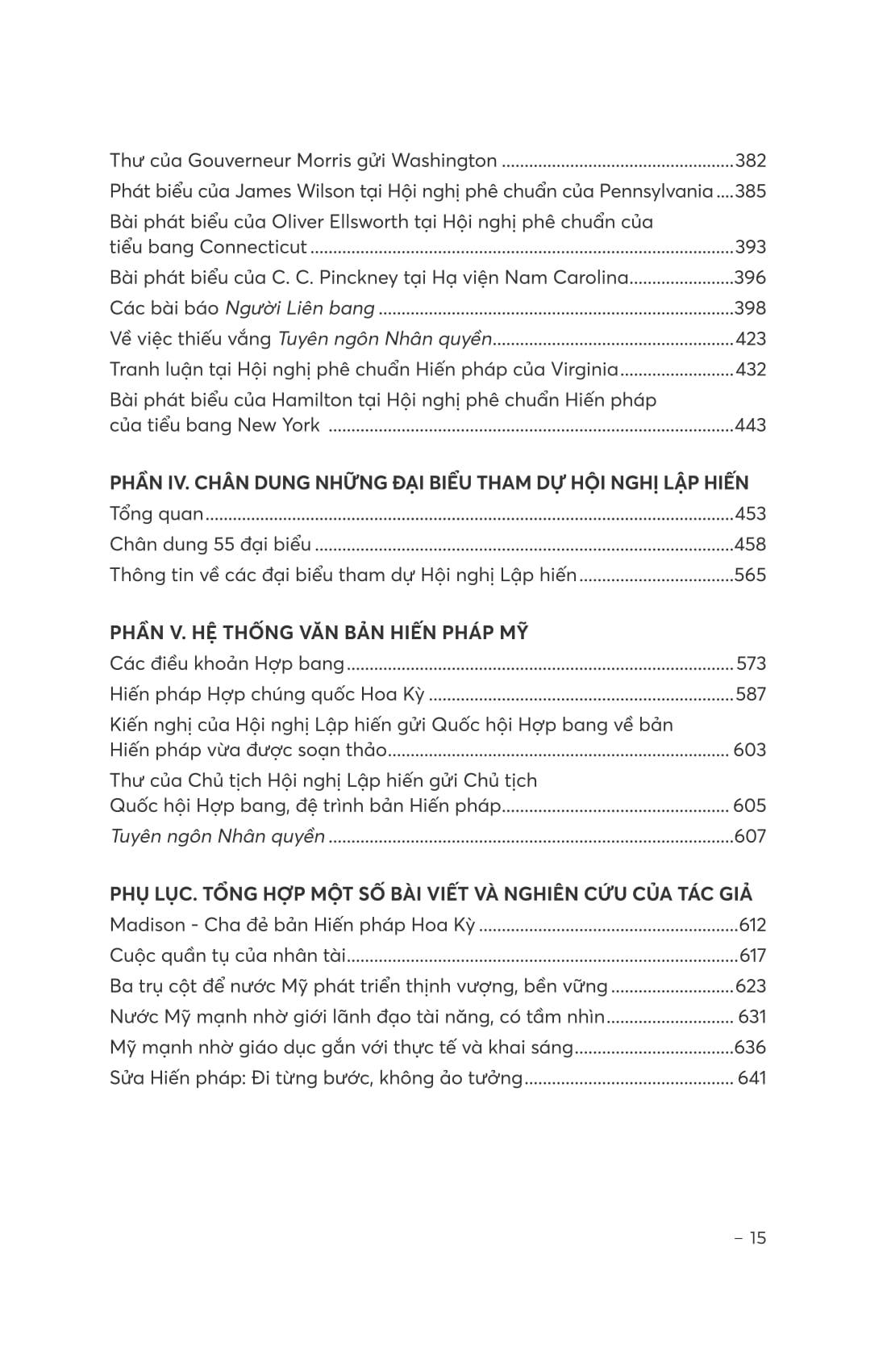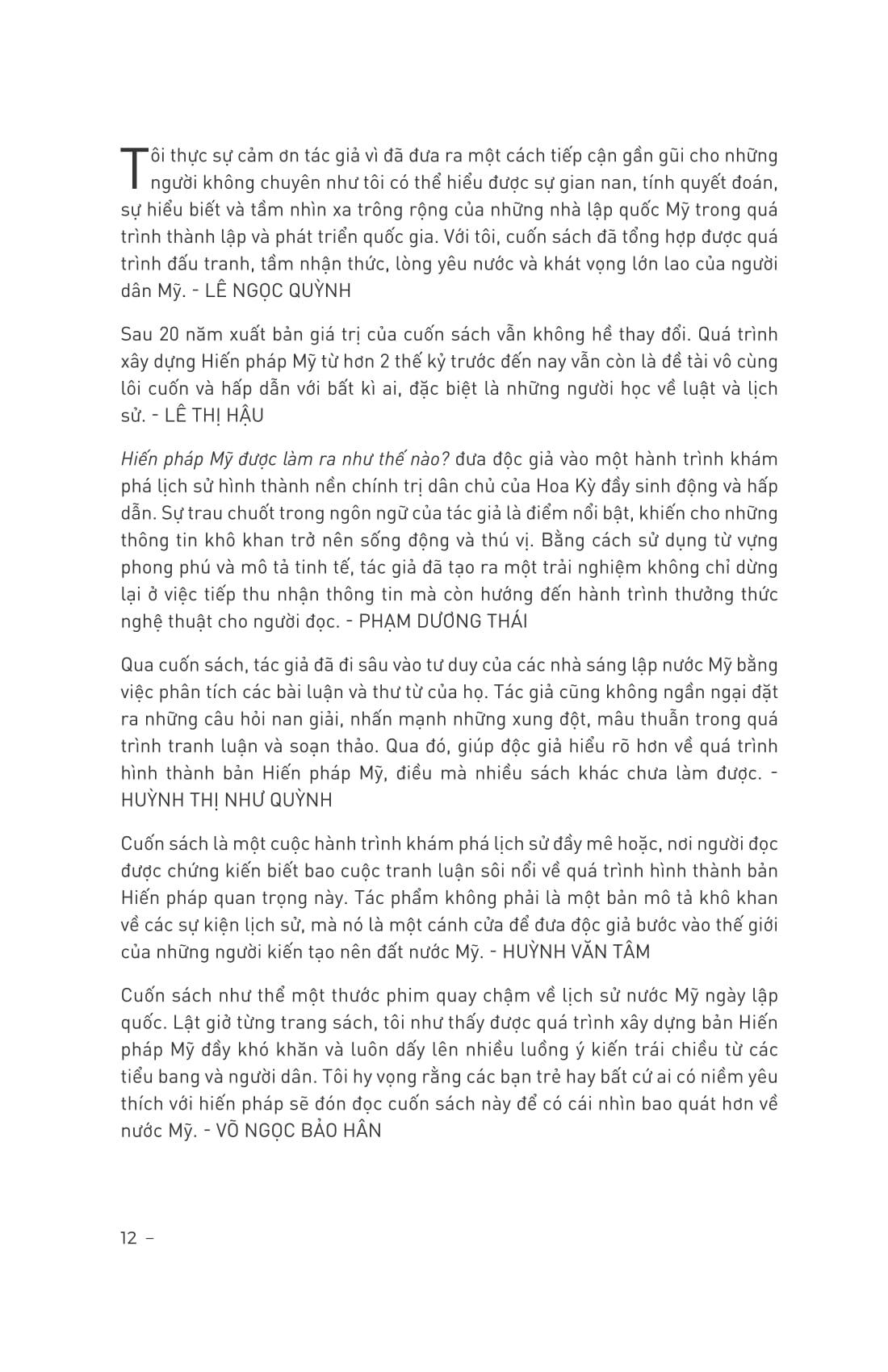 “Hiến pháp Mỹ được làm ra như thế nào?” đã cung cấp một bức tranh toàn cảnh về sự ra đời của Hiến pháp Mỹ, như một lời lý giải cho rất nhiều người có cùng mối băn khoăn. Vậy Hiến pháp Mỹ đã được làm ra như thế nào? Nó được làm ra trong những cuộc tranh luận nảy lửa tưởng như không có lối thoát và những mối bất đồng sâu sắc, bởi những bộ óc vĩ đại có một không hai trong lịch sử, và bằng một tinh thần mà người ta khó có thể tìm một tính từ nào thay thế ngoài cách gọi - “tinh thần Mỹ”. Đó là sự tôn trọng đặc biệt lẫn nhau, thừa nhận những quan điểm hoàn toàn khác biệt, chấp nhận và cùng thỏa hiệp để đi tới lợi ích chung cuối cùng