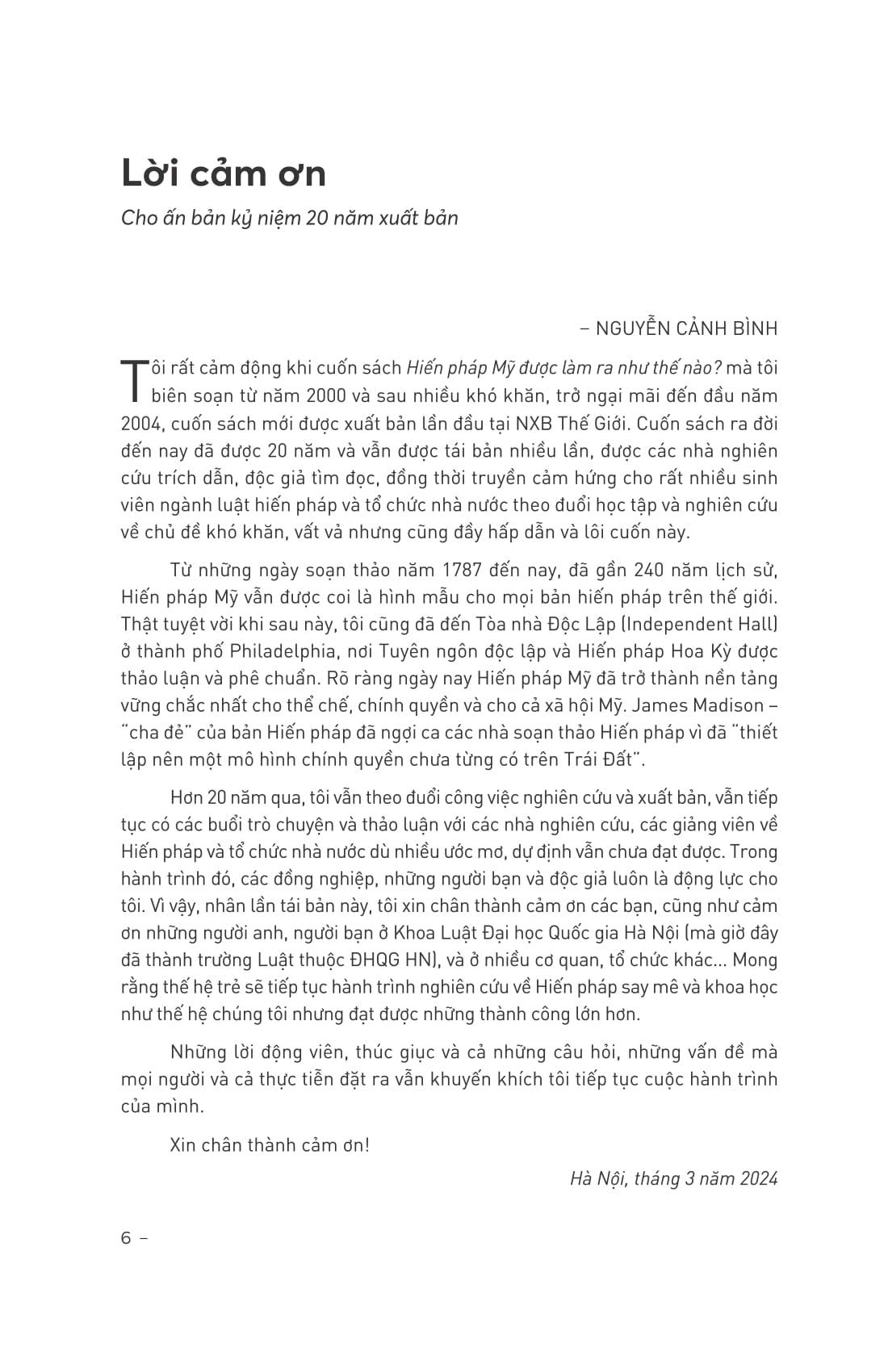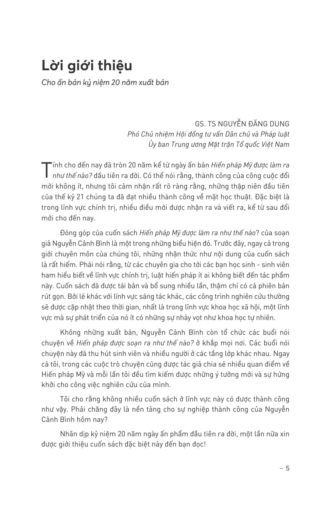 Đây là ấn bản “Hiến pháp Mỹ được làm ra như thế nào?” tái bản kỷ niệm 20 năm xuất bản lần đầu tiên. Phiên bản này không chỉ thay đổi hình thức bìa, hình thức dàn trang trong sách, mà còn bổ sung thêm Lời giới thiệu cho ấn bản mới, Lời cảm ơn của tác giả Nguyễn Cảnh Bình và phần đánh giá của các chuyên gia và độc giả.