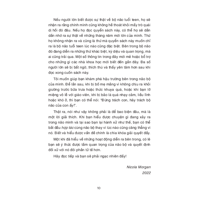 "Hiểu bộ não, lý giải ứng xử tuổi teen" khám phá những bí ẩn của bộ não tuổi teen và giải thích cách nó ảnh hưởng đến suy nghĩ, cảm xúc và hành vi của tuổi mới lớn. Tác giả Nicola Morgan, chuyên gia sức khỏe tâm thần từng đoạt giải thưởng, sử dụng ngôn ngữ dễ hiểu và nhiều ví dụ để giải thích các chủ đề phức tạp như sự phát triển của não bộ, hormone và ảnh hưởng của bạn bè và gia đình đến bộ não tuổi teen.