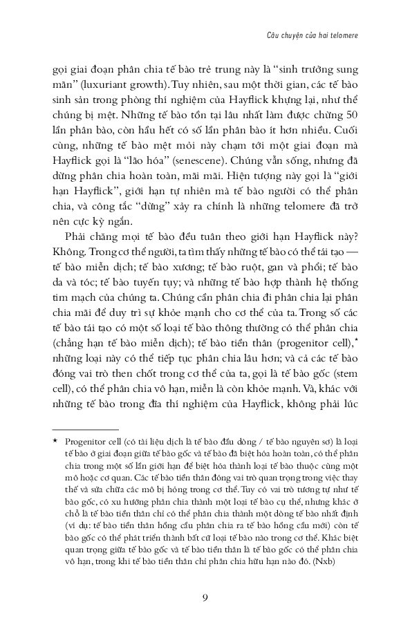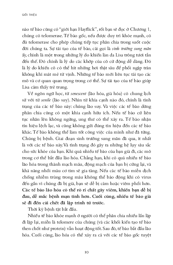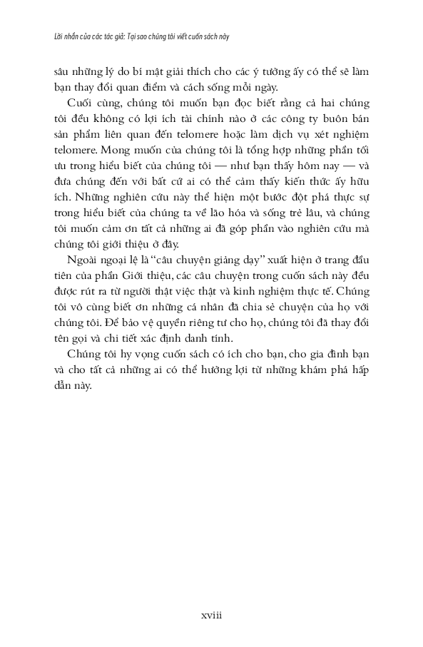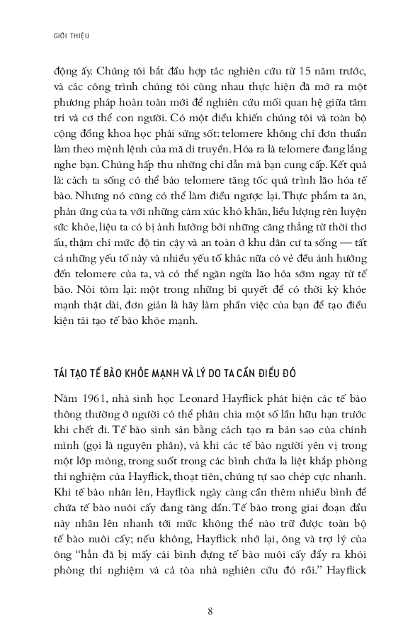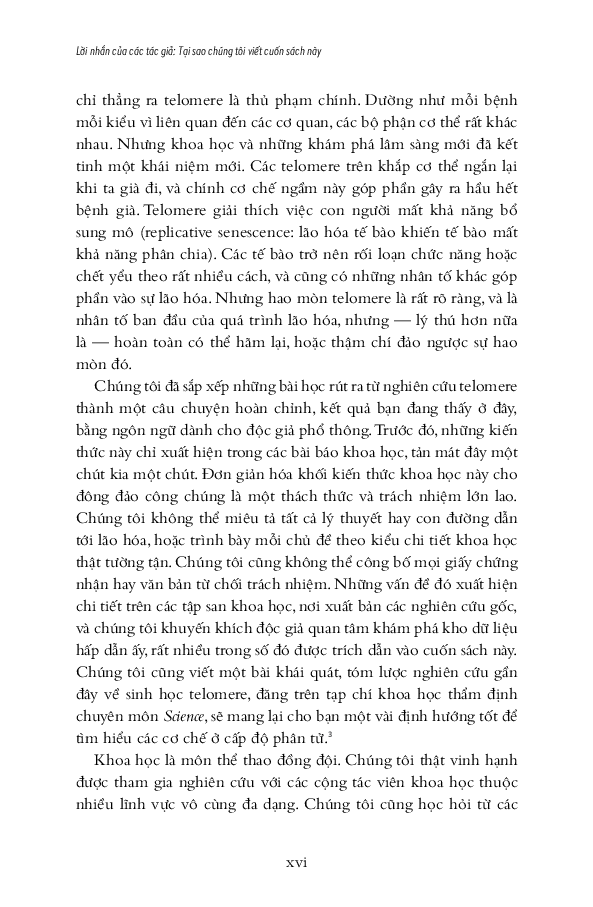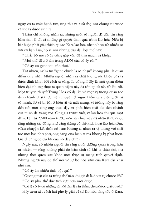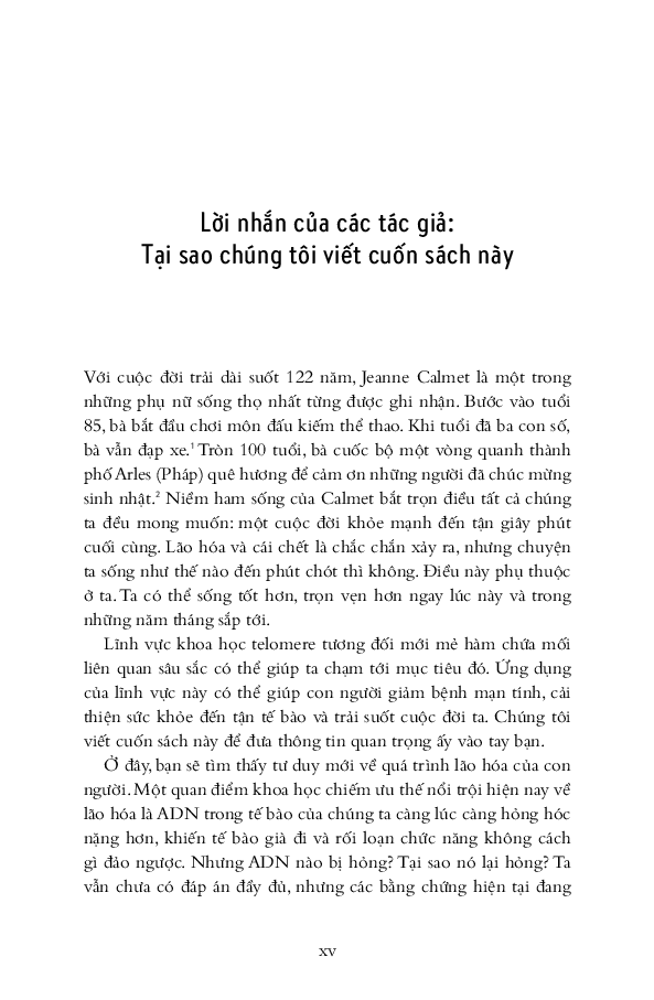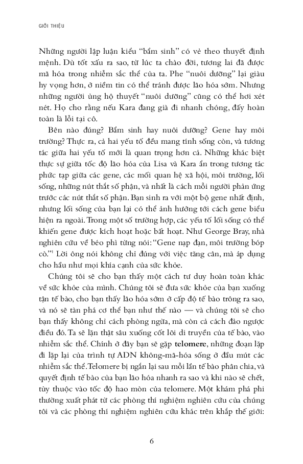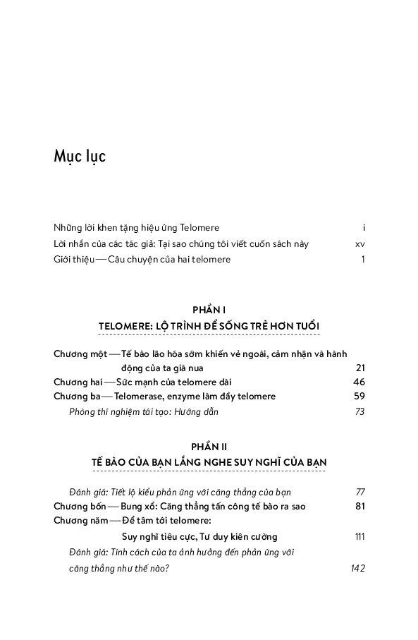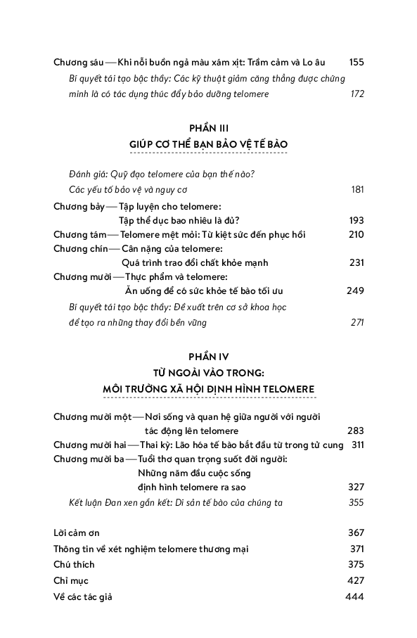 Từ đó, hai tác giả nói về chuyện sống lâu hơn, khỏe mạnh hơn và trẻ trung hơn bằng cách bảo dưỡng tolomere sao cho trì hoãn quá trình hao mòn chậm hết mức có thể. Ước mơ lớn lao bao đời của nhân loại về trường xuân bất lão được viết hết sức hấp dẫn. Sợi tolomere vi diệu được hai tác giả soi từ đủ mọi tác nhân trong cuộc sống: stress ăn mòn tolomere thế nào, suy nghĩ tiêu cực đốt nhanh tolomere ra sao, rồi thì trầm cảm, lo â Nghệ thuật sống trở thành nghệ thuật nuôi dưỡng, chăm sóc và cả dạy dỗ tolomere trong cơ thể! Hơn cả nghệ thuật sống cho cấp độ cơ bản là sinh học tế bào, cuốn sách này nói về thuật dưỡng thân có căn cứ khoa học.