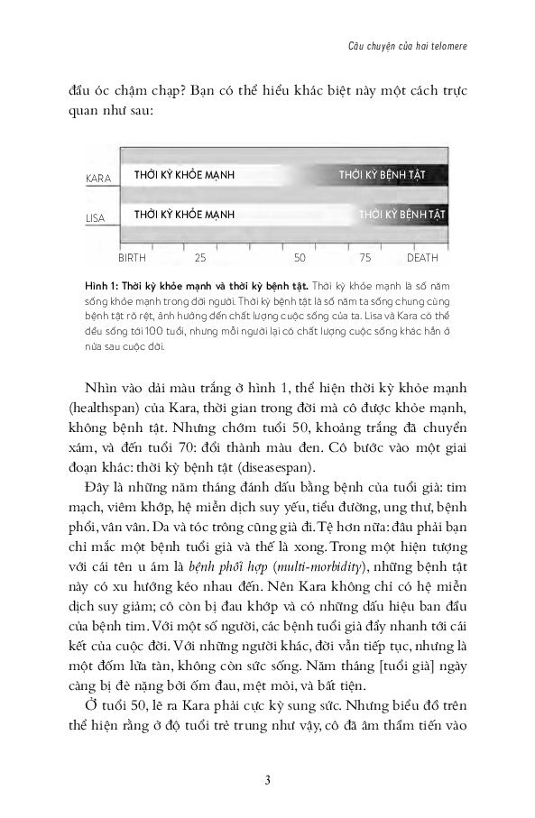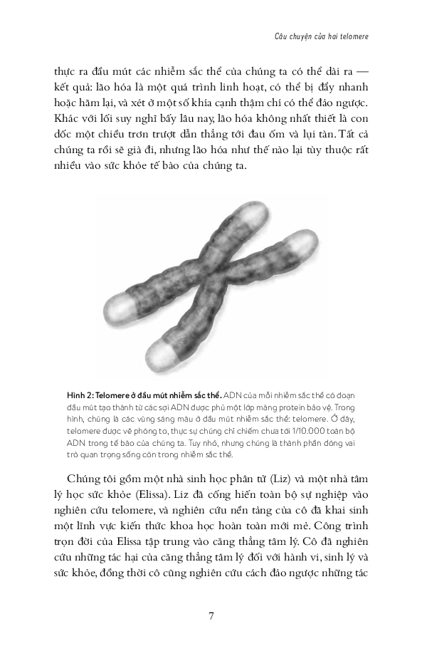 Việc phát hiện ra telomere ở đầu mút nhiễm sắc thể đưa tiến sĩ Elizabeth Blackburn, tác giả chính của cuốn sách, cùng hai đồng nghiệp đoạt giải Nobel sinh lý và y khoa năm 2009. Khi ta ra đời, tolomere ở đầu mút nhiễm sắc thể bắt đầu mòn dầ Chính mức độ cạn sạch telomere kiểm soát mức độ và tốc độ lão hóa của ta.