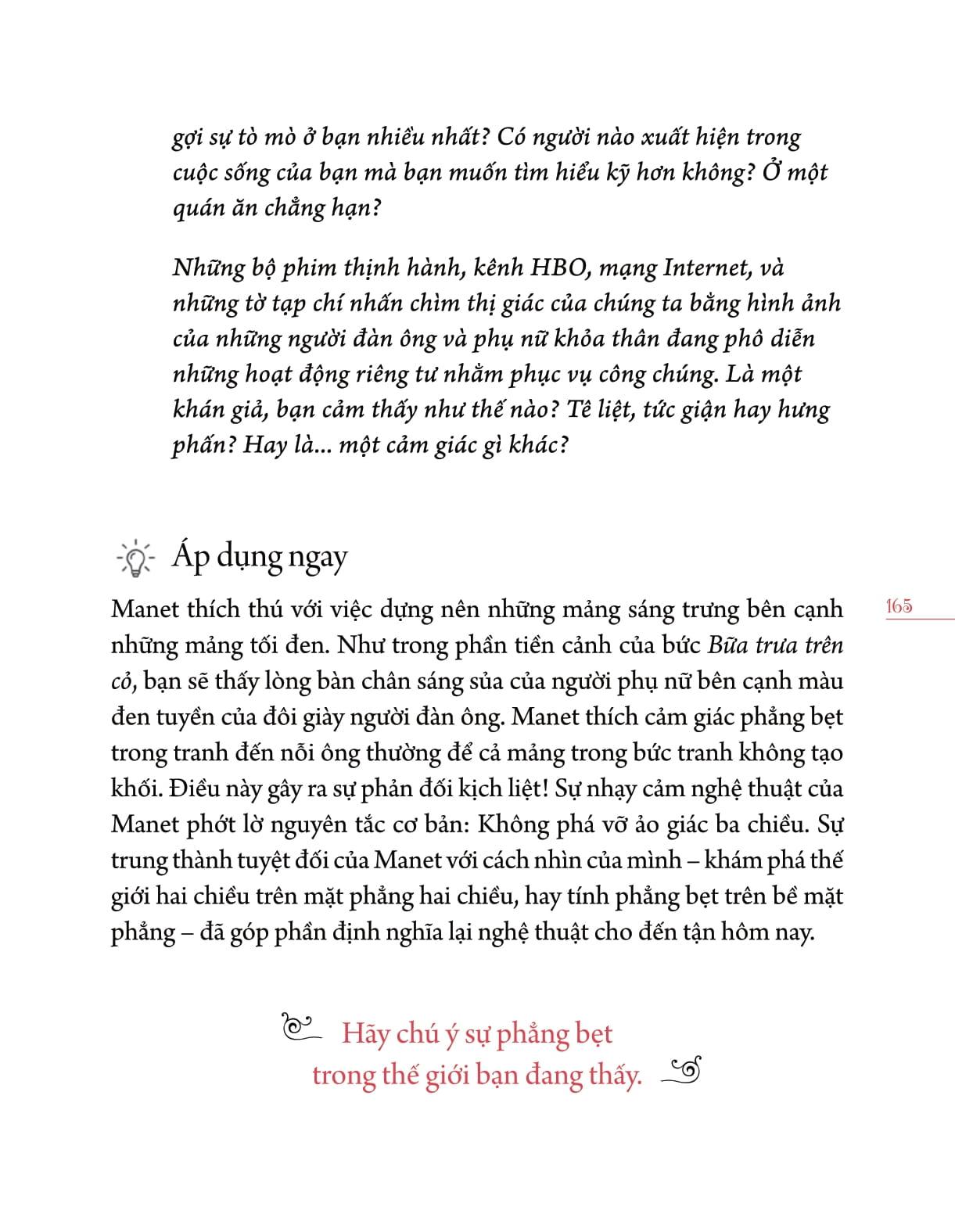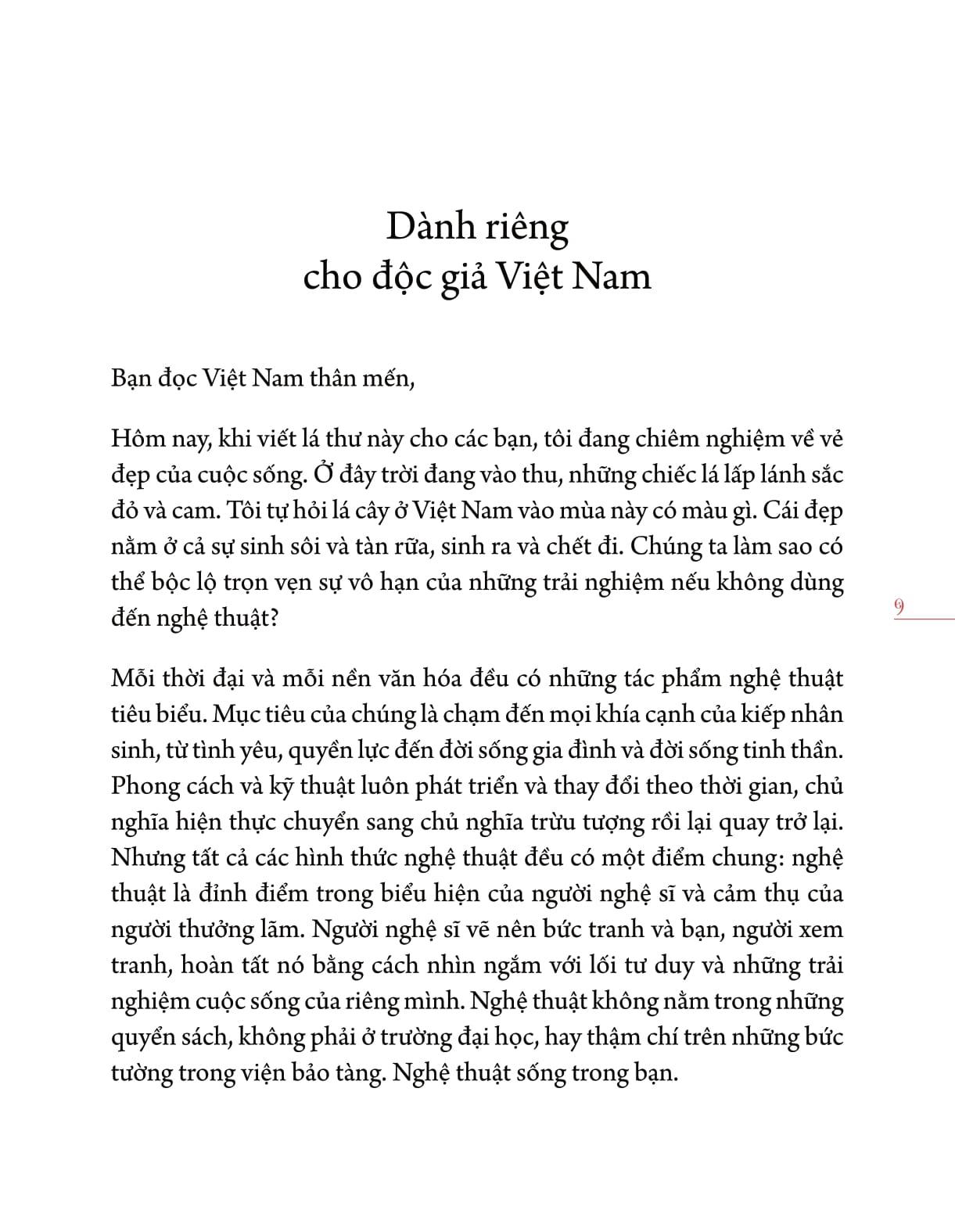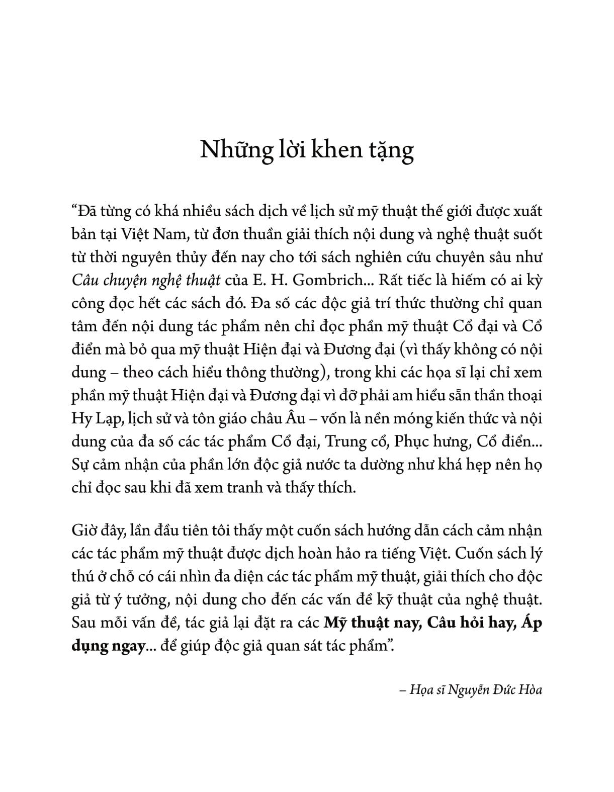 Quyển sách này cho bạn những hiểu biết cơ bản nhưng sâu sắc về mỹ thuật (đã được bạn "tiêu hóa" qua quá trình đọc và suy ngẫm). Để lần sau khi được mời dự triển lãm mỹ thuật, bạn sẽ tự tin dự và trao đổi cùng tác giả về cảm nhận của chính mình.