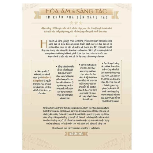 Nhất là hiện nay, trong thời đại công nghệ số, khi trí tuệ nhân tạo đang từng bước tham gia vào các lĩnh vực sáng tạo, âm nhạc cũng bắt đầu hòa nhịp với những đổi mới ấy. Cuốn sách này sẽ là một tài liệu quan trọng giúp người đọc nắm vững những nền tảng lý thuyết cổ điển và mở rộng hiểu biết về cách hòa âm và sáng tác, từ đó có thể tự tin đón nhận sự thay đổi và tận dụng những công cụ “trí tuệ nhân tạo” một cách chủ động và sáng tạo.